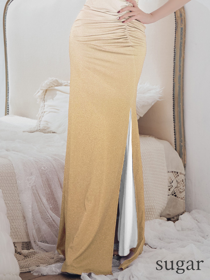 【MONOQLO/モノクロ】グラデーション/ ラメ/ ワンショルダー/ ストレッチ/ スリット/ タイト/ ロングドレス/ キャバドレス/ long【OF05】 [MO23016-GD-S2501]
