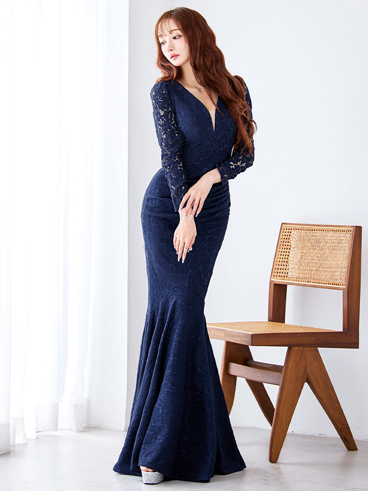 XLサイズあり【UNA VALERIE / ウナヴァレリェ】 総レース/ 長袖/ 袖あり/ タック/ マーメイド/ ロングドレス long[OF05] [V60177L-DKR-S2502]