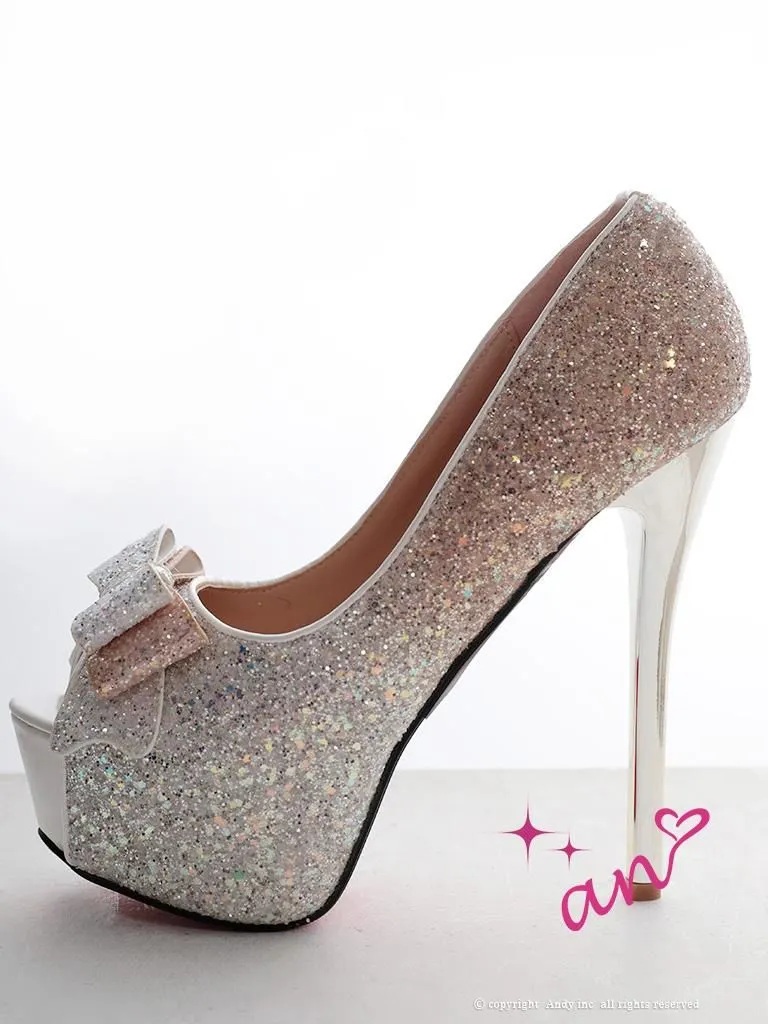 きらきらと煌めくラメグリッターにリボンモチーフが乙女心擽るオープントゥパンプス♡