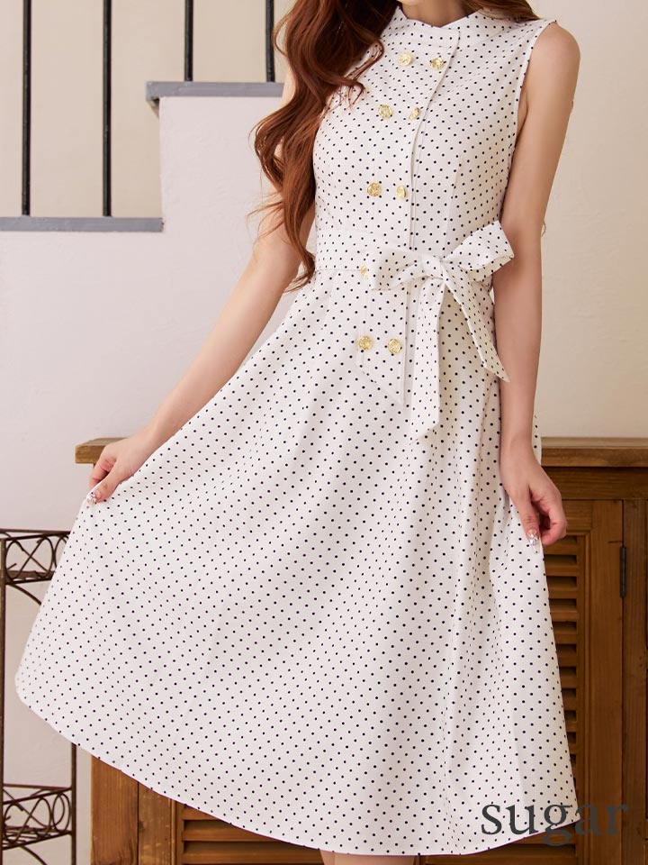 XS-Lサイズあり 【GINZA COUTURE/銀座クチュール】ドット/ ボタン/ ハイネック/ ノースリーブ/ Aライン/ フレア/ 膝丈/ ミディアムドレス/ キャバドレス[OF2]