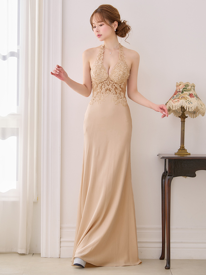 高級感のあるホルターネックデザインが気品溢れる女性を演出。