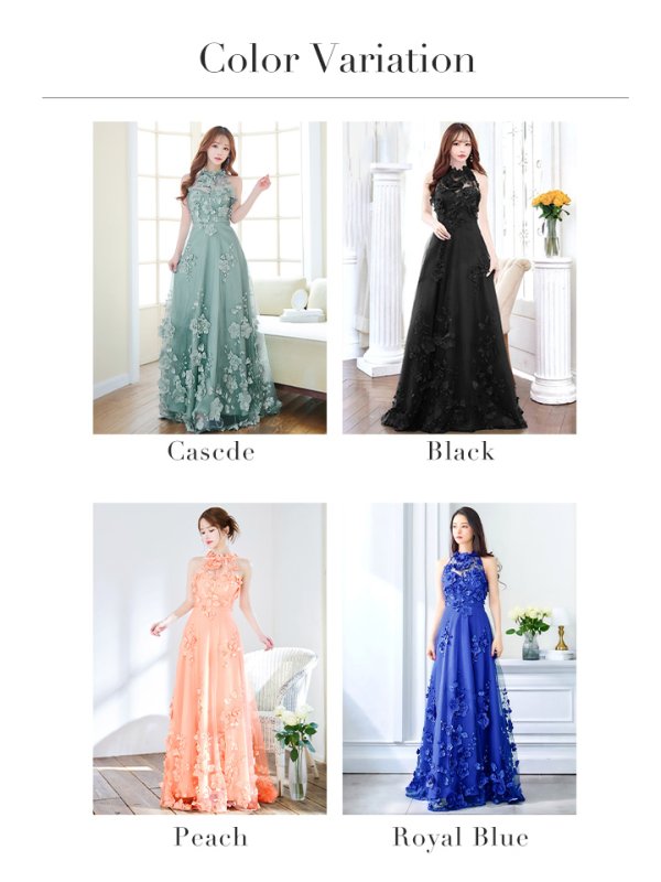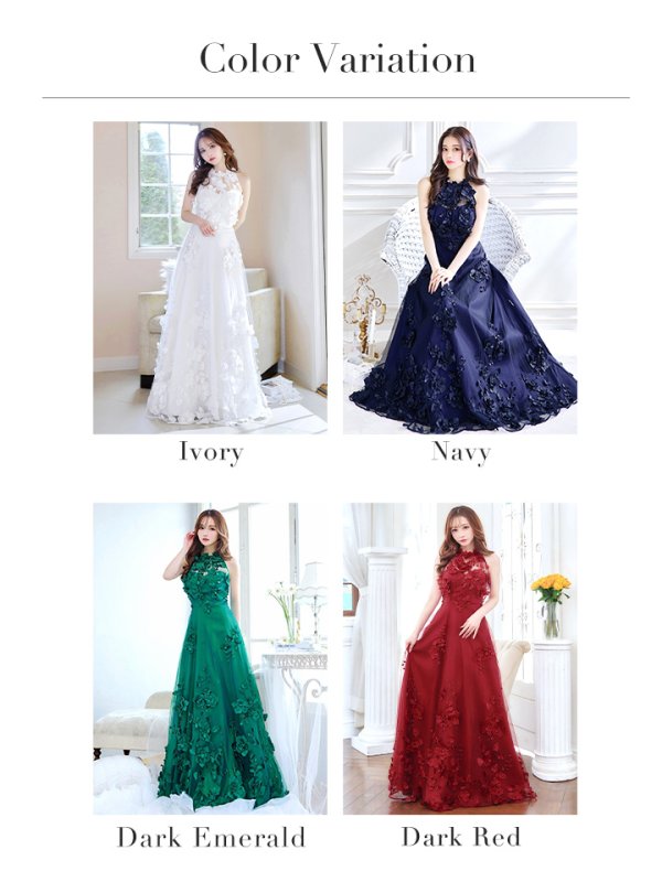 立体感あるフラワー刺繍が華やかで存在感溢れるロングドレス。