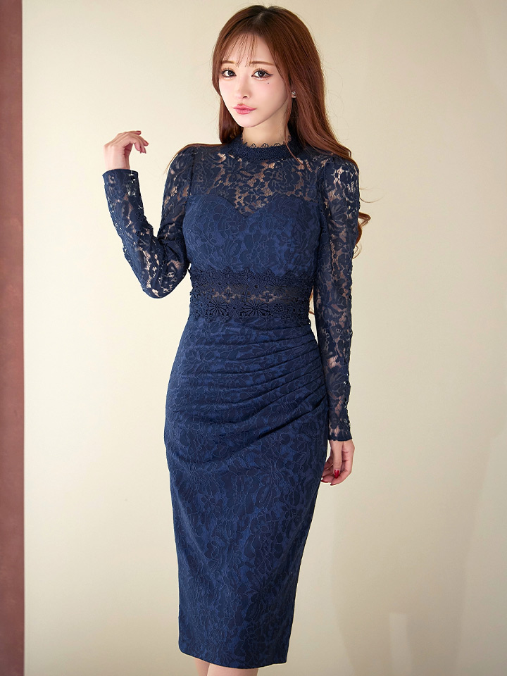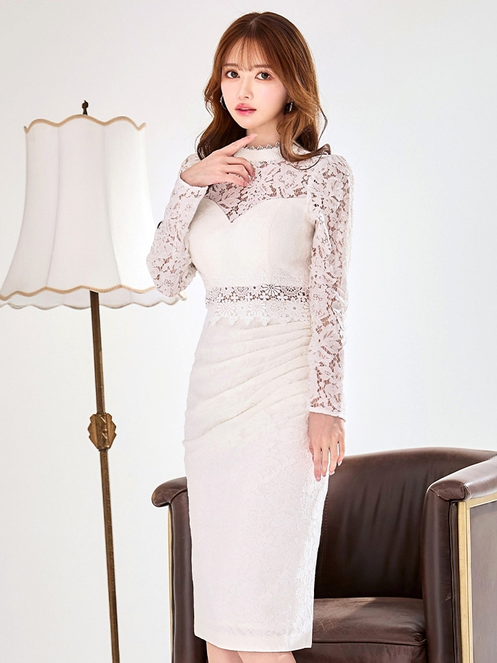 - > Lサイズあり【VANESSA HEART / ヴァネッサハート】【OF05】 総レース/ タック/ ハイネック/ 袖あり/ 長袖/ タイトスリーブ/ 膝丈/ ミディアムドレス/ キャバドレス
