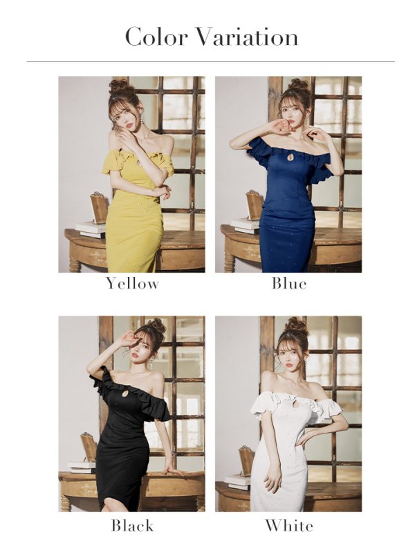 XSサイズあり【Veautt/ヴュート】【OF05】オフショルダー/ バストカット/ ビジュー/ シフォン/ ファスナー/ ミディアムドレス/ キャバドレス [VT082503-Y-S250307]