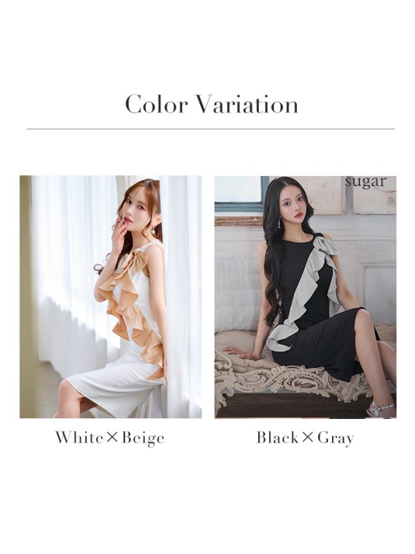 - > XS-Lサイズあり【ERUKEI エルケイ】バイカラー/ リボンフリル/ ノースリーブ/ 膝丈/ タイト/ ワンピース/ ミディアムドレス/ キャバドレス[OF2]