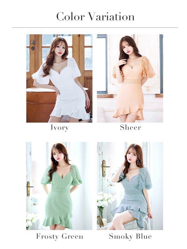 - > XS-Lサイズあり【Donia Quinn / ドニアクイーン】 総レース/ パフスリーブ/ 袖あり/ 裾フリル/ マーメイド/ ミニドレス/ キャバドレス[OF05]