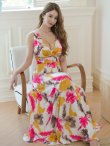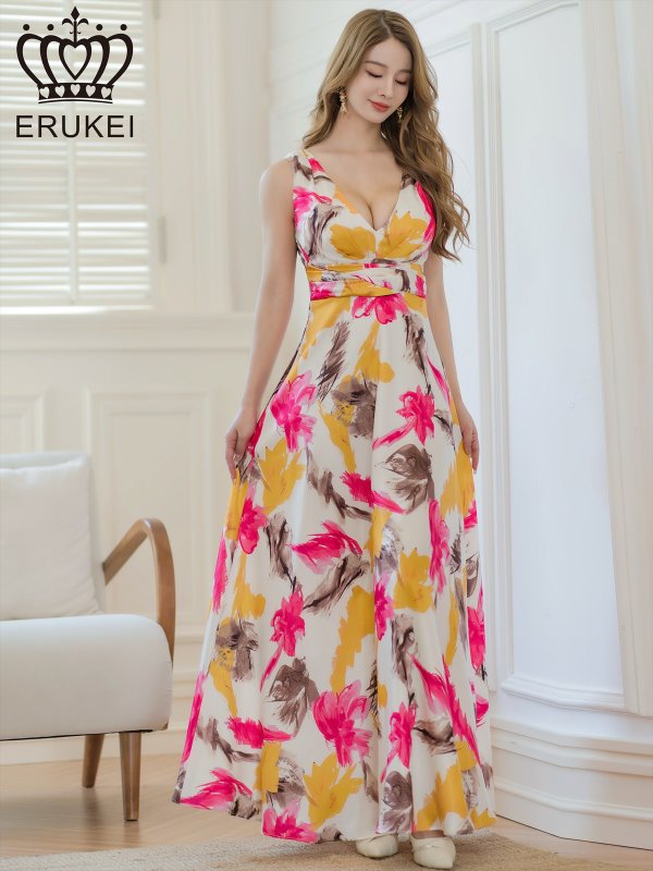 XS-Lサイズあり【ERUKEI エルケイ】ペイント柄/ プリント/ ノースリーブ/ Vネック/ Aライン/ フレア/ ロングドレス/ キャバドレス long[OF2] [LKE35014-WxP-2503]