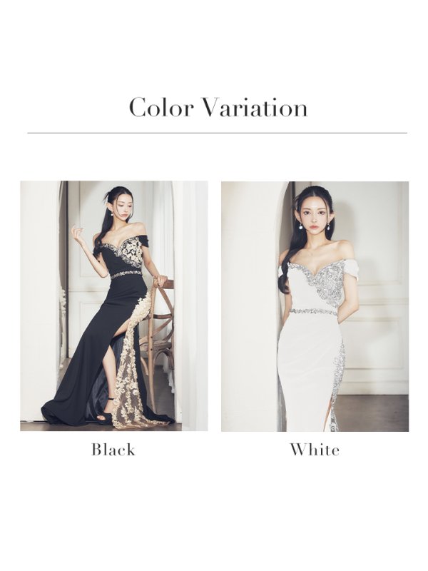 Lサイズあり【IRMA/イルマ】刺繍/ ビジュー/ タック/ オフショルダー/ スリット/ マーメイド/ ロングドレス/ キャバドレス long【HC02】 [41741-IR-B-S250328]