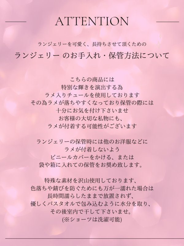 ▼こちらのランジェリーは撮影・イベント用にデザインされた物です。通常のお洗濯はして頂けません。▼商品の特性上、生地の取り位置により柄の出方・ニュアンスなど多少の個体差が生じ、画像と表情が異なることがございます。