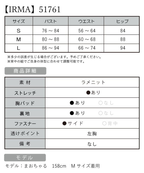 B:86-94 / W:66-74 / H:94 [着丈](脇下)約134cm |