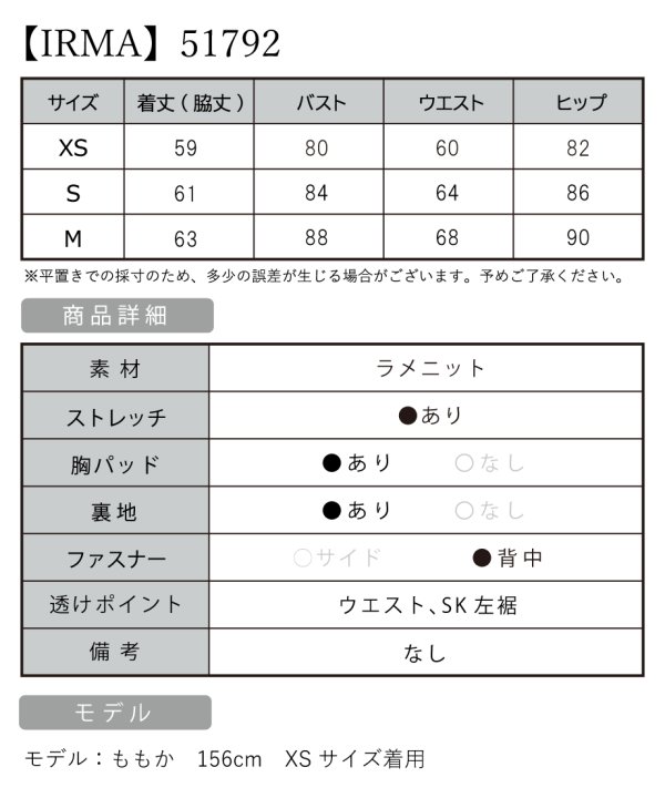 | XSサイズ | B:80 / W:60 / H:82 [着丈](脇下):約59cm |