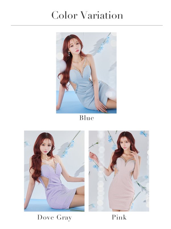ラメ生地と煌めくビジューがラグジュアリーな雰囲気を演出し、ウエストカットアウトで細見え効果も◎