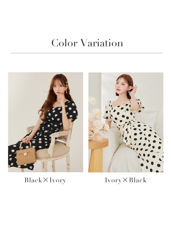 XS-Lサイズあり 【GINZA COUTURE/銀座クチュール】ドットプリント/ 水玉/ 半袖/ 袖あり/ パフスリーブ/ リボンベルト/ Aライン/ ミディアム丈/ ワンピース/ ミディアムドレス/ キャバドレス[OF2] [LKC25084-IVxB-S250415]