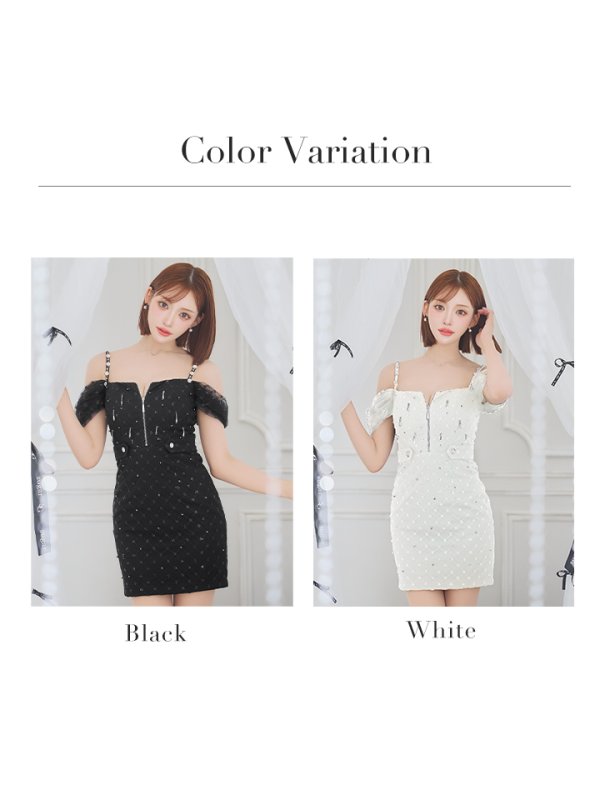 XSサイズあり【an /アン】パール/ スパンコール/ ショルダービジュー/ キャミソール/ オフショル/ チュールスリーブ/ フロントジッパー/ タイト/ ミニドレス/ キャバドレス[OF05] [AOC3865-B-S250425]