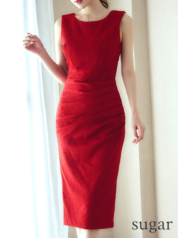 - > 【ISA FERRIS/ イサフェリス】【OF05】シンプル/ ラメ/ ノースリーブ/ タック/ ストレッチ/ 膝丈/ タイト/ ミディアムドレス/ キャバドレス