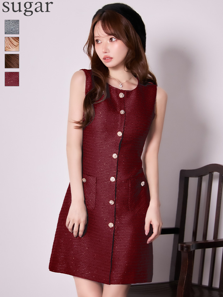 XS-Lサイズあり【GINZA COUTURE/銀座クチュール】ツイード/ スパンコール/ ボタン/ ノースリーブ/ Aライン/ 膝丈/ ワンピース/ ミディアムドレス/ キャバドレス[OF2] [LKC25082-B-S2505]