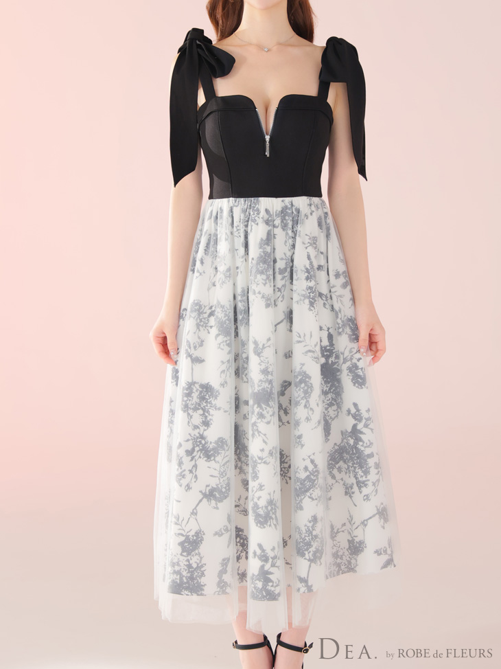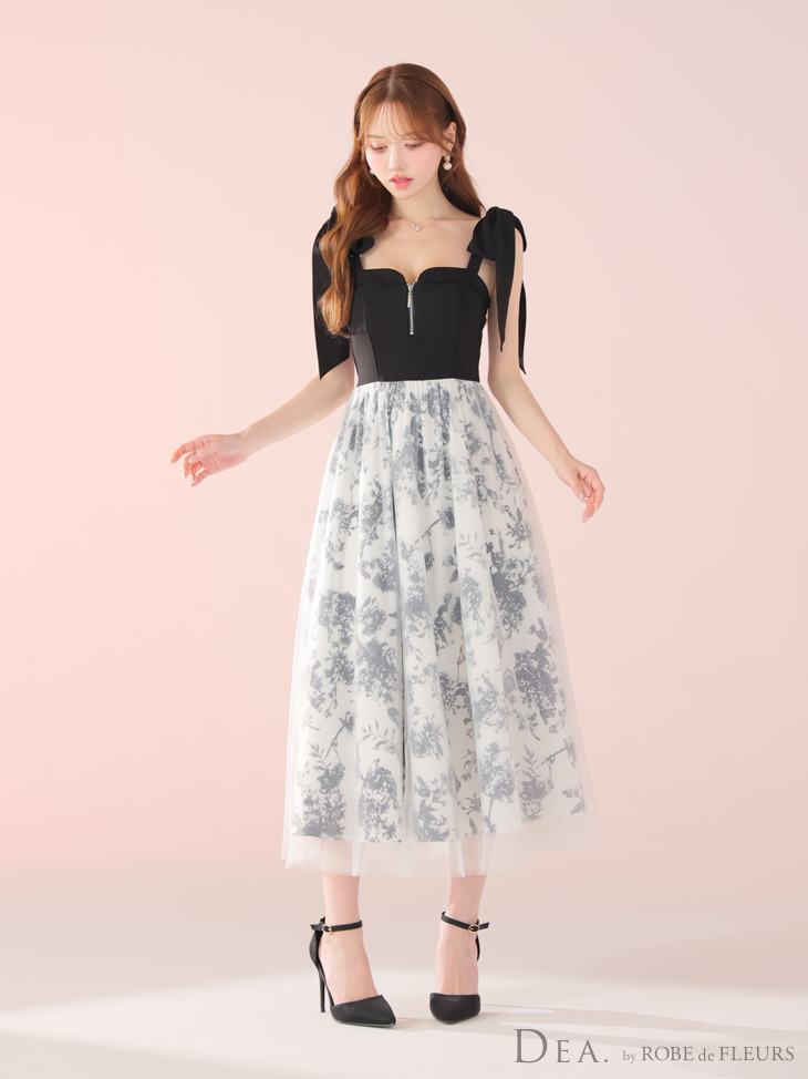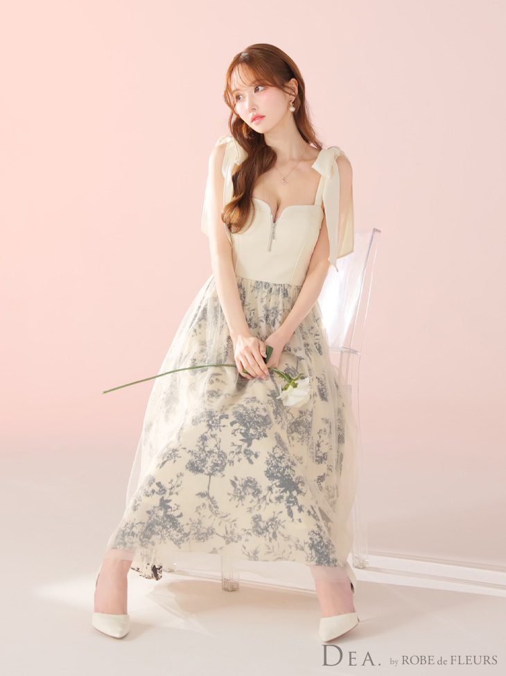XS-Lサイズあり【DEA./ディア】花柄チュール/ 肩リボン/ フレア/ ロング/ ワンピース/ ミモレ丈/ ミディアムドレス/ キャバドレス long[OF08] [DE4301-IV-S250507]