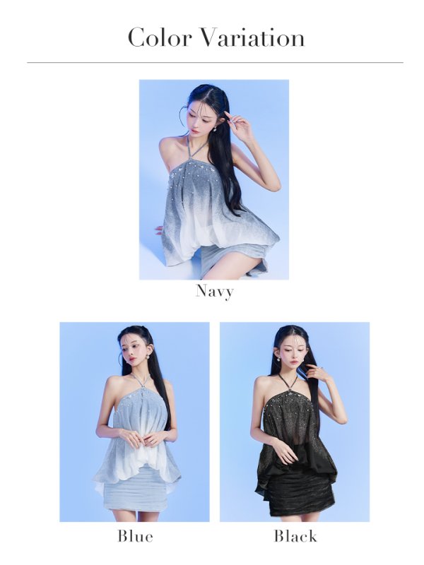 上半身はホルターネックでヘルシーな肌見せを叶え、スカート部分はタイトシルエットで美脚ラインを強調。