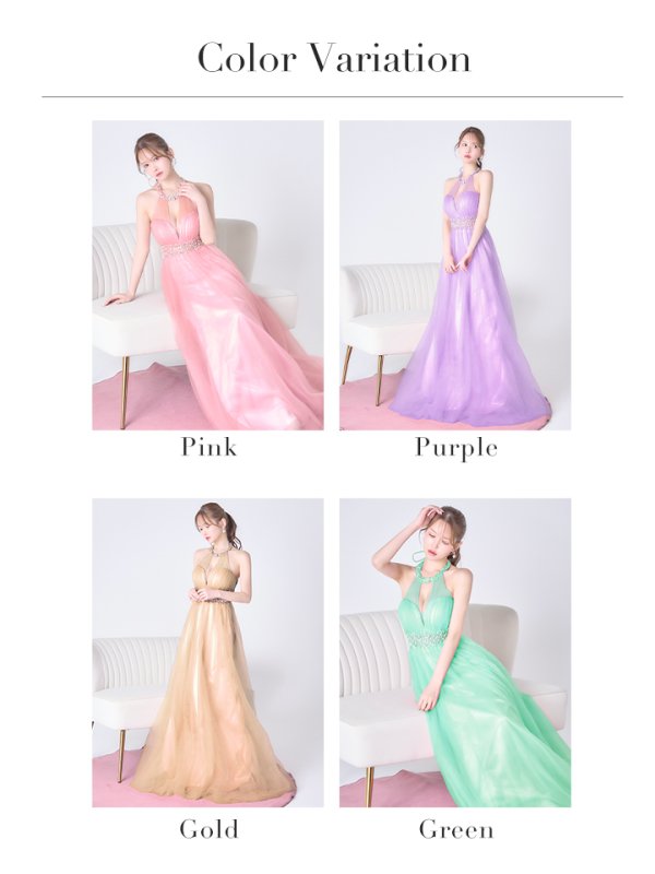 【Lip line/リップライン】ビジュー/ ホルターネック/ シアー/ チュール/ バックスピンドル/ フレア/ Aライン/ ロングドレス/ キャバドレス long[HC03] [A-0208-GR-S2506]