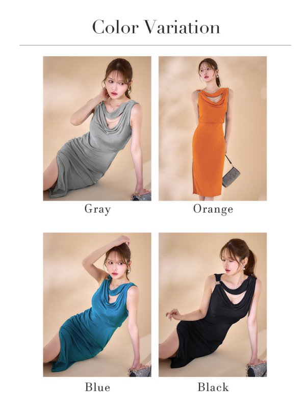 XSサイズあり【Veautt/ヴュート】【OF05】ドレープ/ チェーン/ リング/ バストカット/ ウエストマーク/ サイドファスナー/ ミディアムドレス/ キャバドレス [VT022515-OR-S250620]