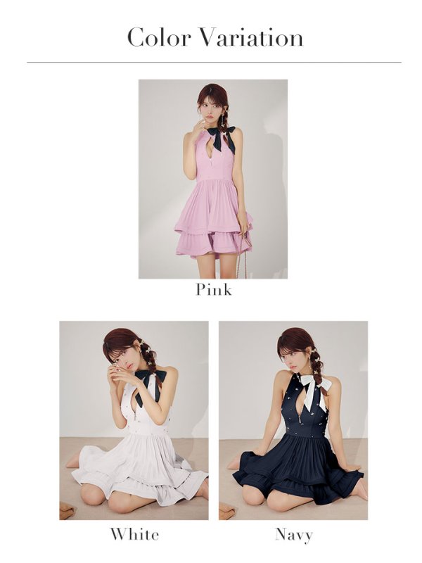 - > XSサイズあり【an /アン】ハイネック/ リボン/ ビジュー/ バストジップ/ ノースリーブ/ ティアード/ フリル/ フレア/ ミニドレス/ キャバドレス[OF05]