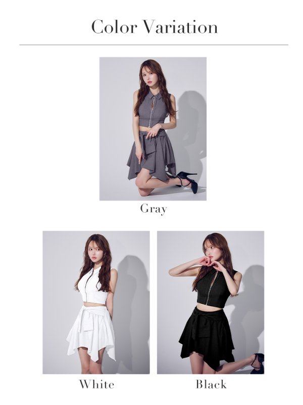 XSサイズあり【an /アン】2way/ ラメ/ フロントジッパー/ 襟付き/ アシンメトリー/ フレア/ ノースリーブ/ セットアップ/ ミニドレス/ キャバドレス[OF05] [AOC3917-GY-S250711]