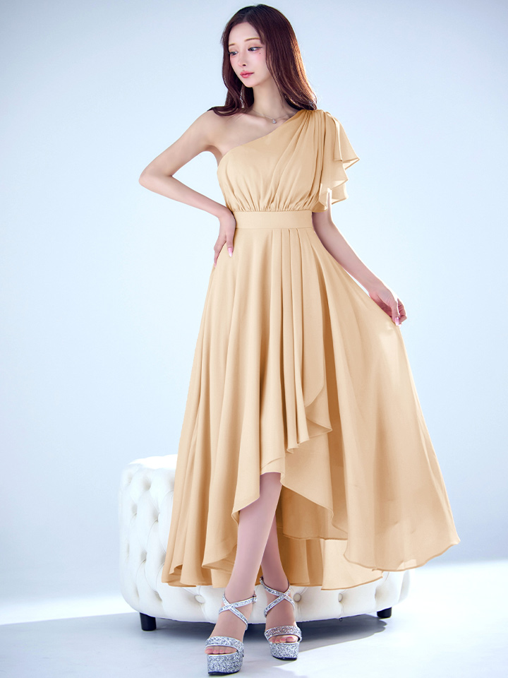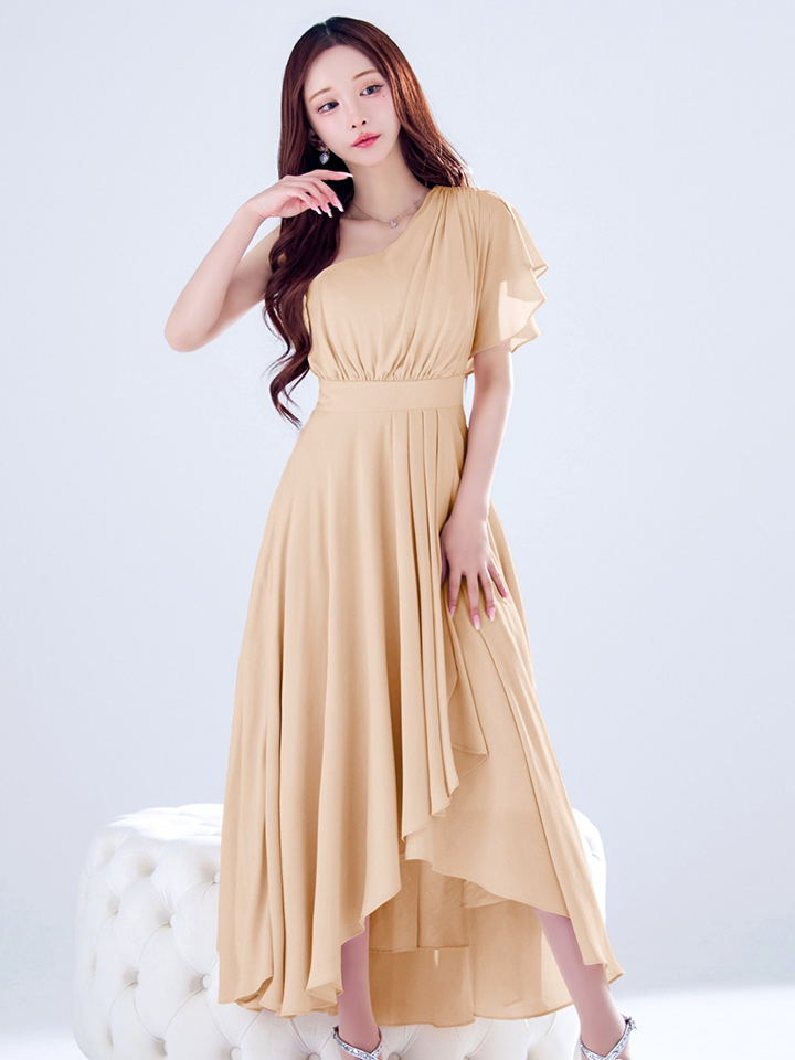 Lサイズあり【VANESSA HEART / ヴァネッサハート】【OF05】ワンショルダー/ フリル/ アシンメトリー/ テールカット/ ミモレ丈/ ワンピース/ ミディアムドレス/ キャバドレス [H60208HL-BE-S2507]