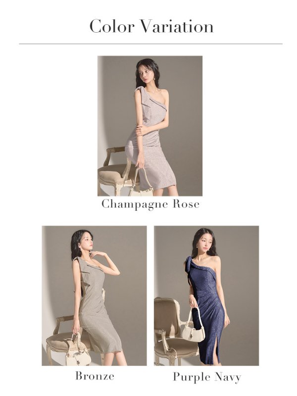 Lサイズあり【JEAN MACLEAN/ジャンマクレーン】リボン/ ワンショルダー/ ラメニット/ タック/ ストレッチ/ スリット/ 膝丈/ タイト/ ミディアムドレス/ キャバドレス[OF2A]【一部予約商品/12月下旬発送予定】 [51836-JM-PLNV-S250718]