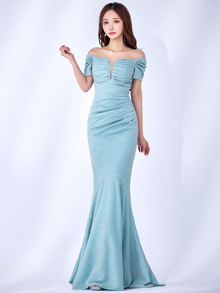Lサイズあり【UNA VALERIE / ウナヴァレリェ】 ラメ/ オフショルダー/ バストシアー/ タック/ マーメイド/ ロングドレス long[OF05] [V60160L-Sky-S2507]