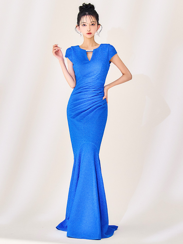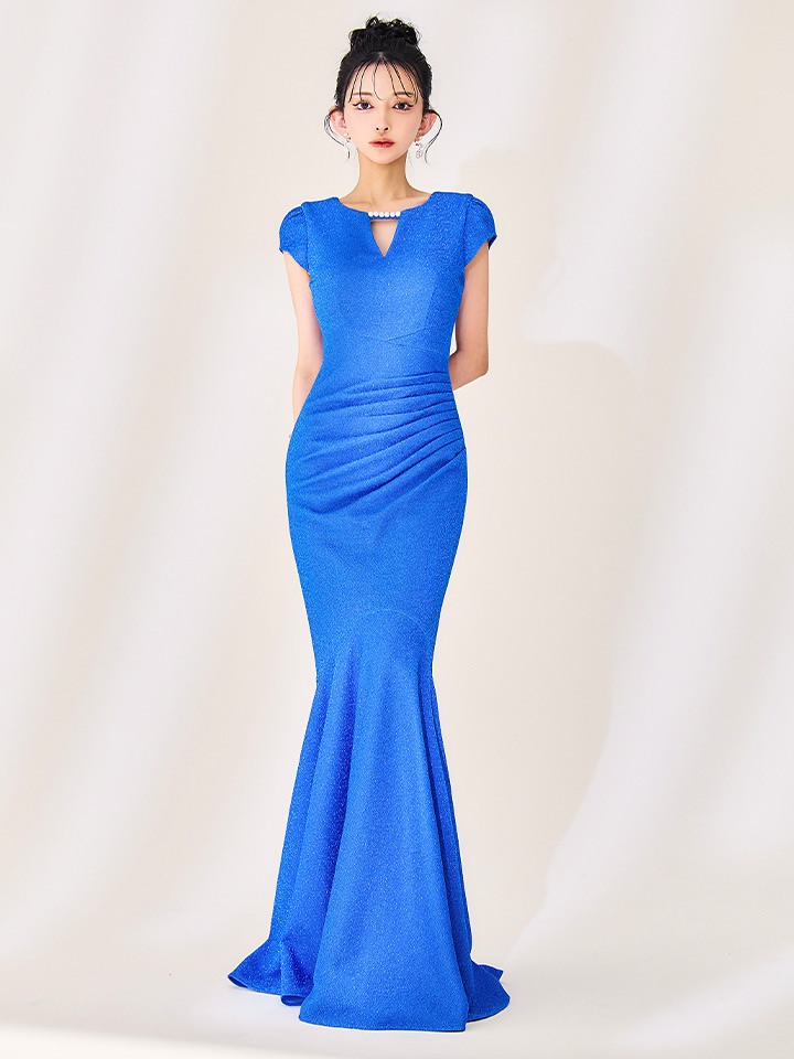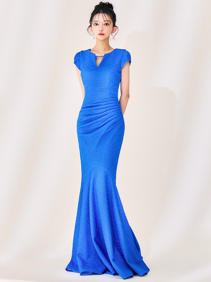 Lサイズあり【UNA VALERIE / ウナヴァレリェ】マーメイド/ ラメ/ パール/ 半袖/ サイドタック/ ストレッチ/ ロングドレス/ キャバドレス[OF05] [V60159L-PerryBL-S2507]