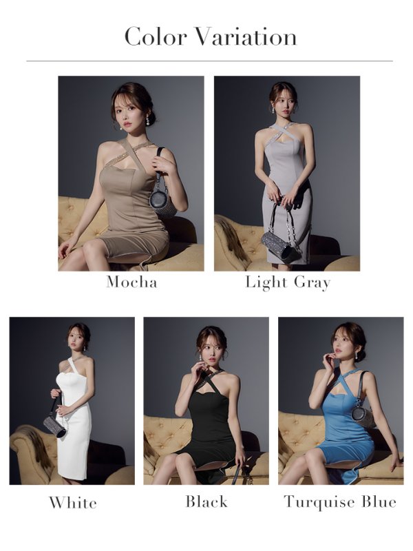 XSサイズあり【Veautt/ヴュート】【OF05】デコルテクロスデザイン/ アシンメトリー/ ビジュー/ サイドファスナー/ タイト/ ミディアムドレス/ キャバドレス [VT022514-MOC-S250725]