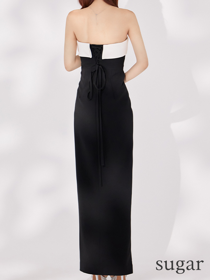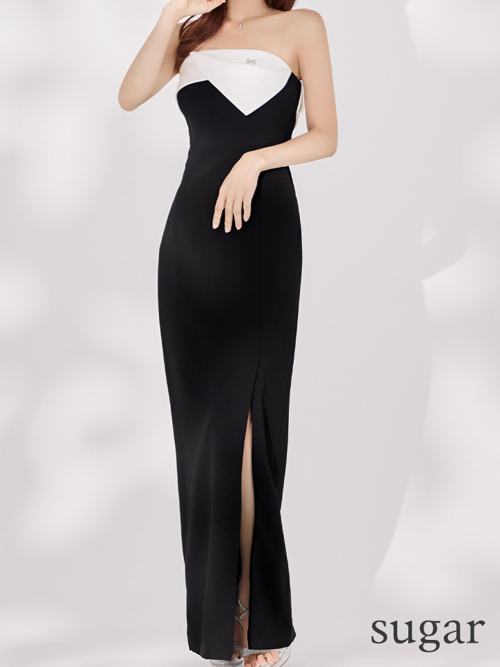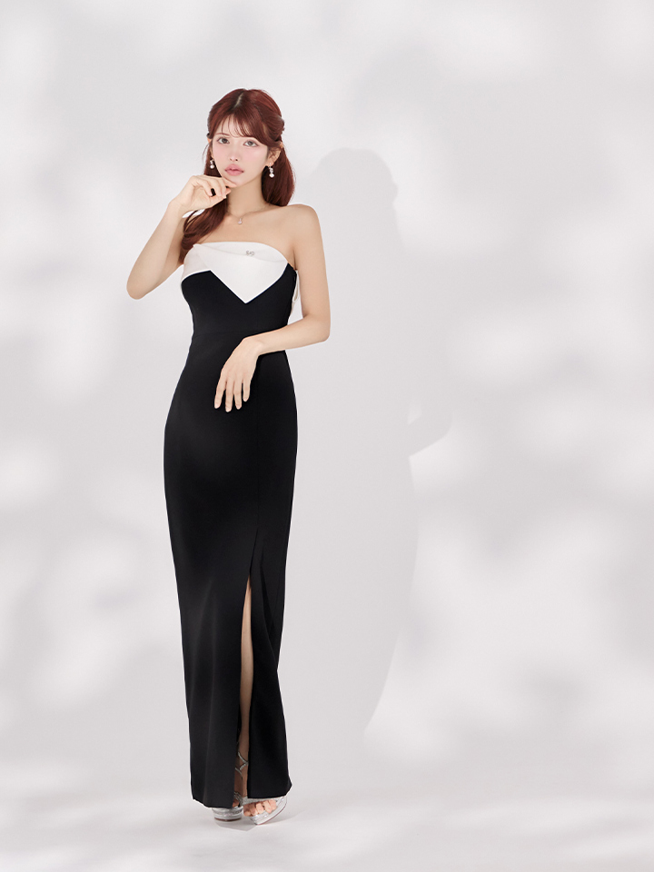 XS-Lサイズあり【ERUKEI エルケイ】モノトーン/ ベアトップ/ スリット/ リボンモチーフ/ ビジュー/ タイト/ ロングドレス/ キャバドレスlong[OF2]