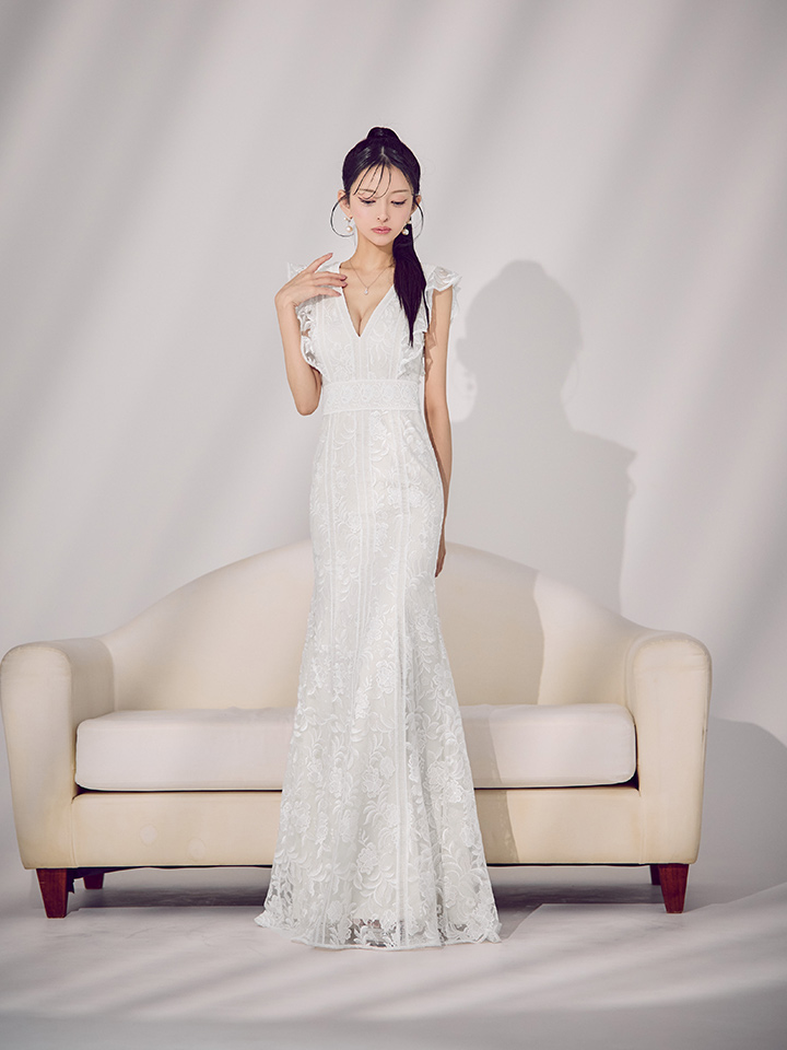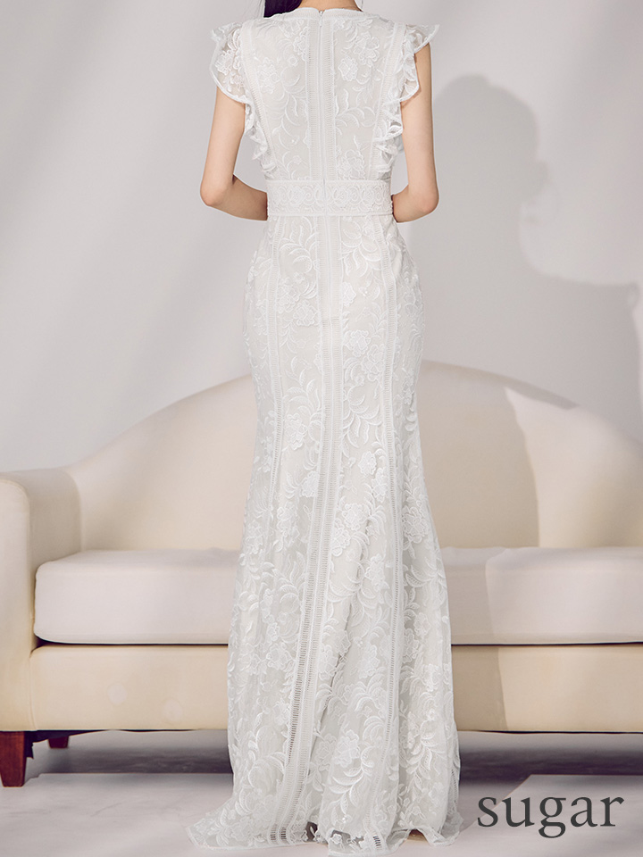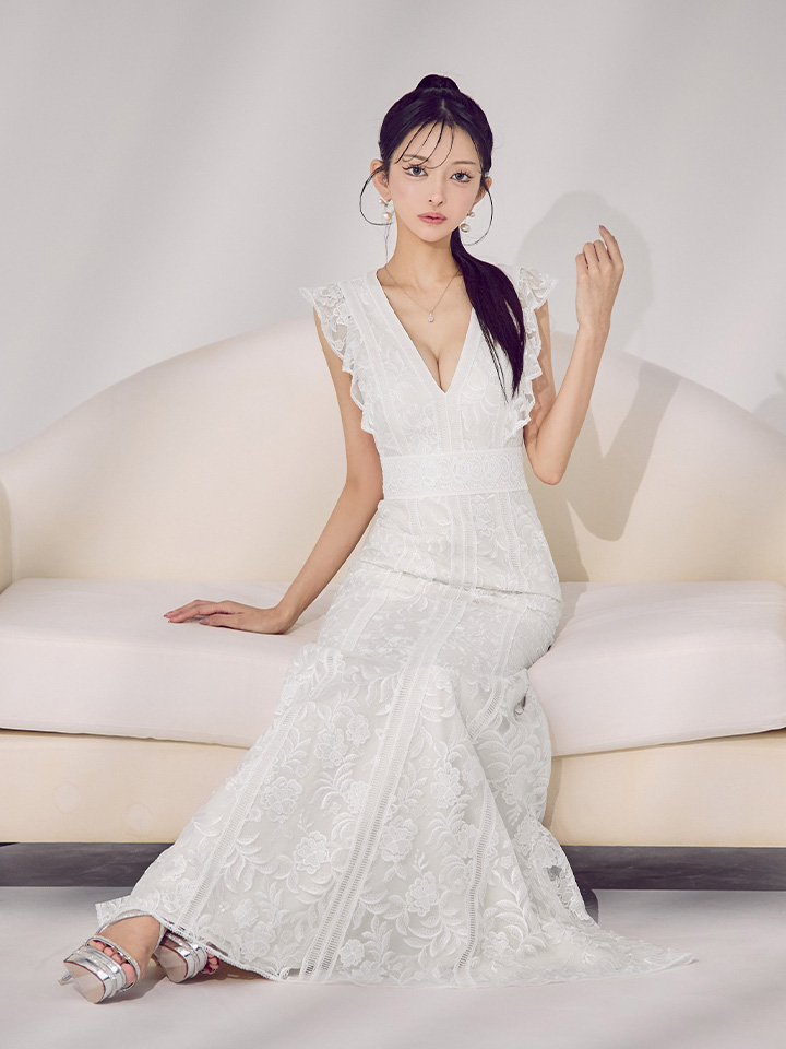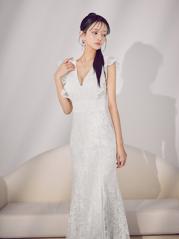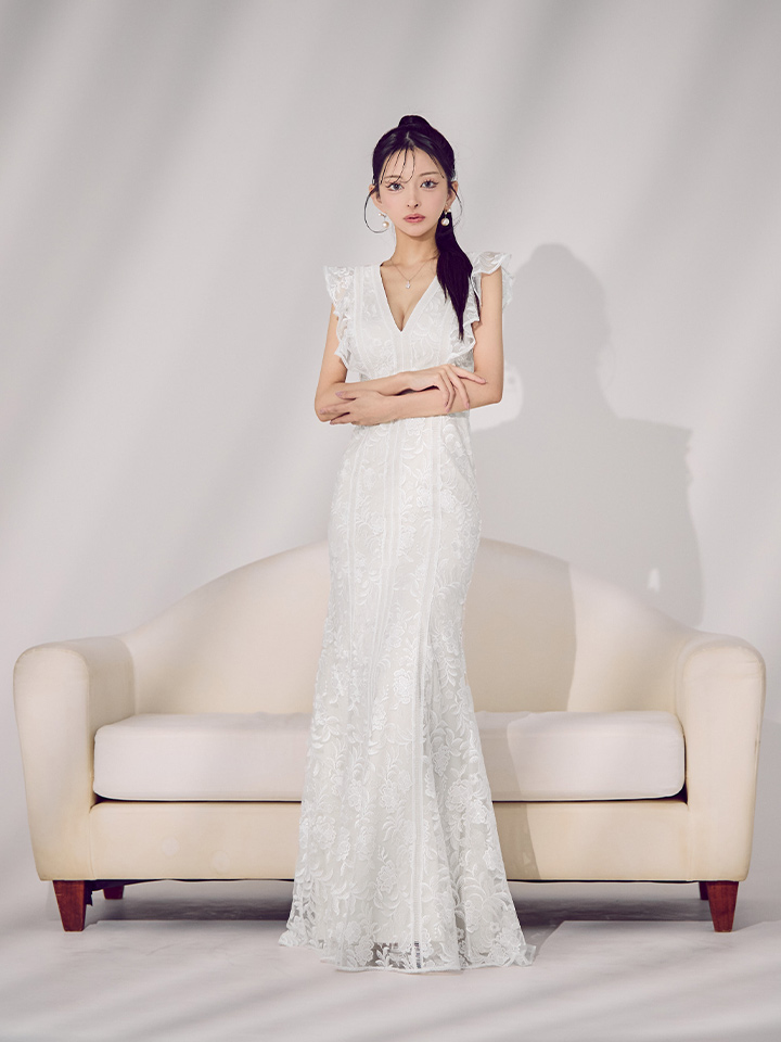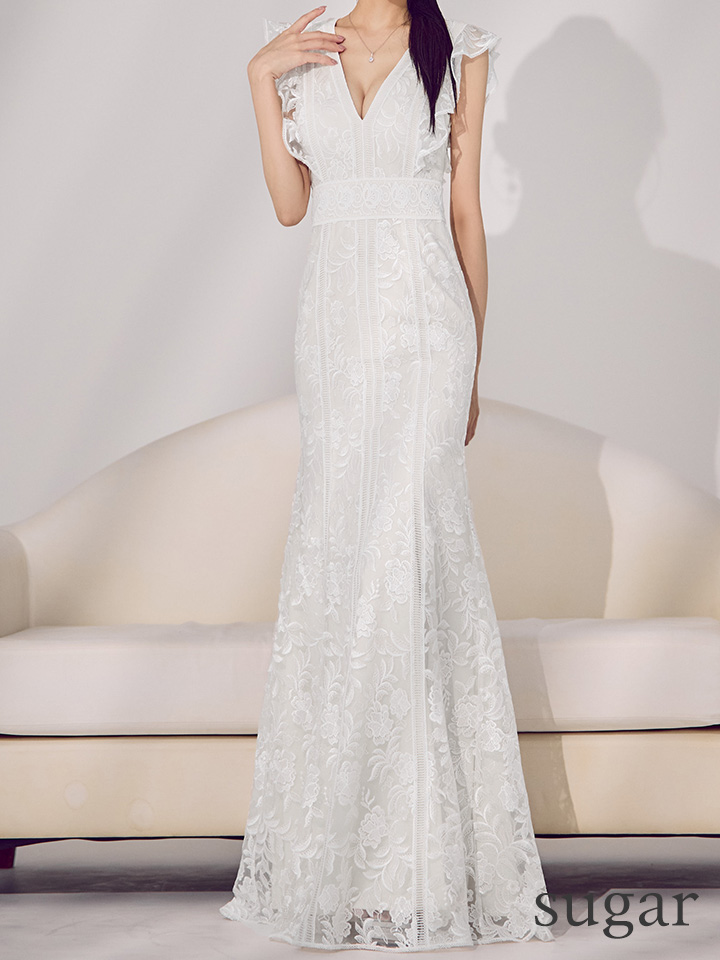 XS-Lサイズあり【SETTAN/セッタン】フラワー刺繍/ 総レース/ フリルスリーブ/ Vネック/ ハイウエスト/ タイト/ ロングドレス / キャバドレス long[OF2] [LKS37088-W-S250728]