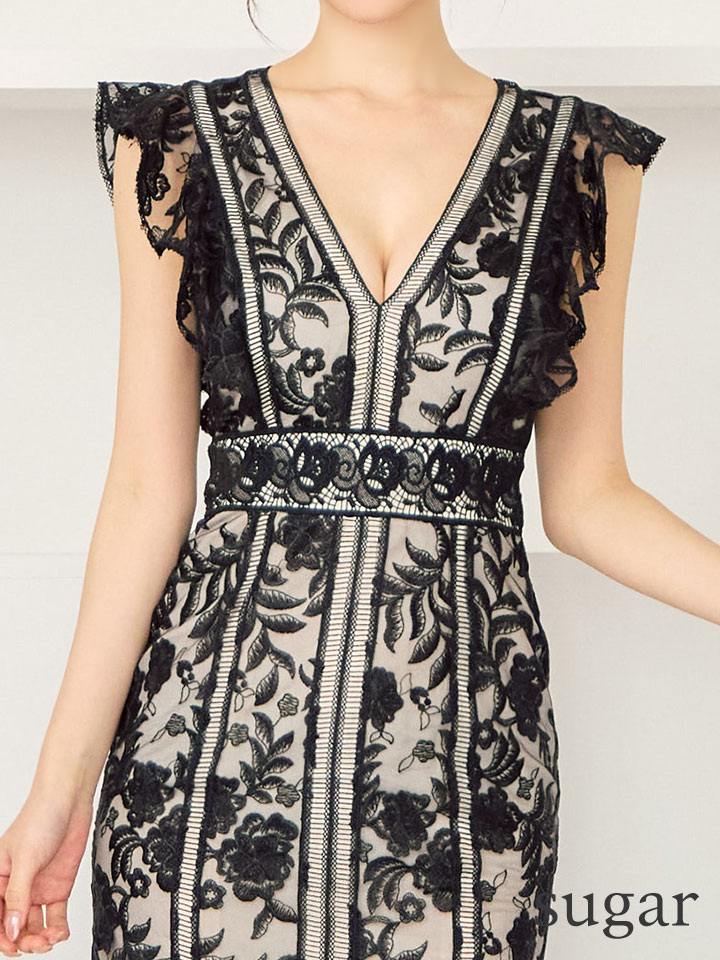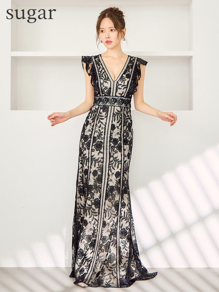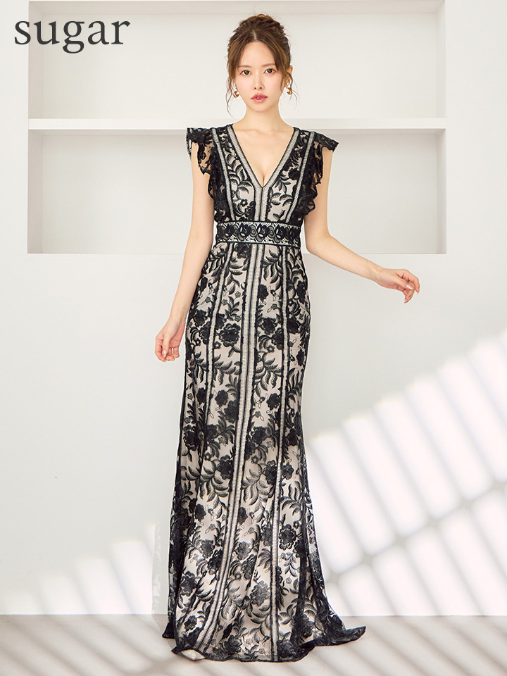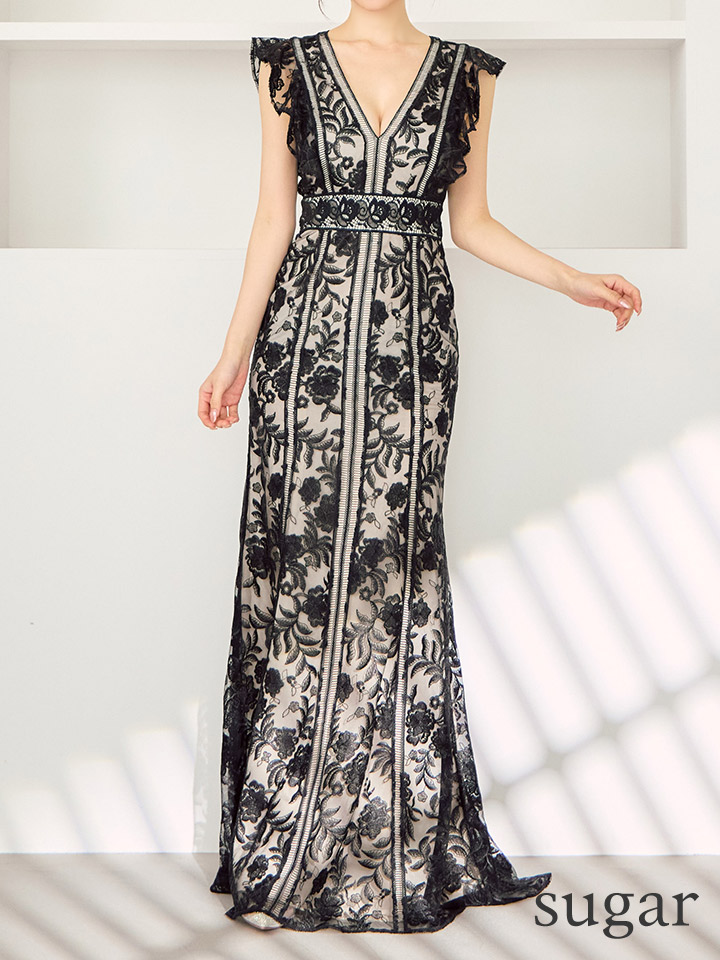 XS-Lサイズあり【SETTAN/セッタン】フラワー刺繍/ 総レース/ フリルスリーブ/ Vネック/ ハイウエスト/ タイト/ ロングドレス / キャバドレス long[OF2]