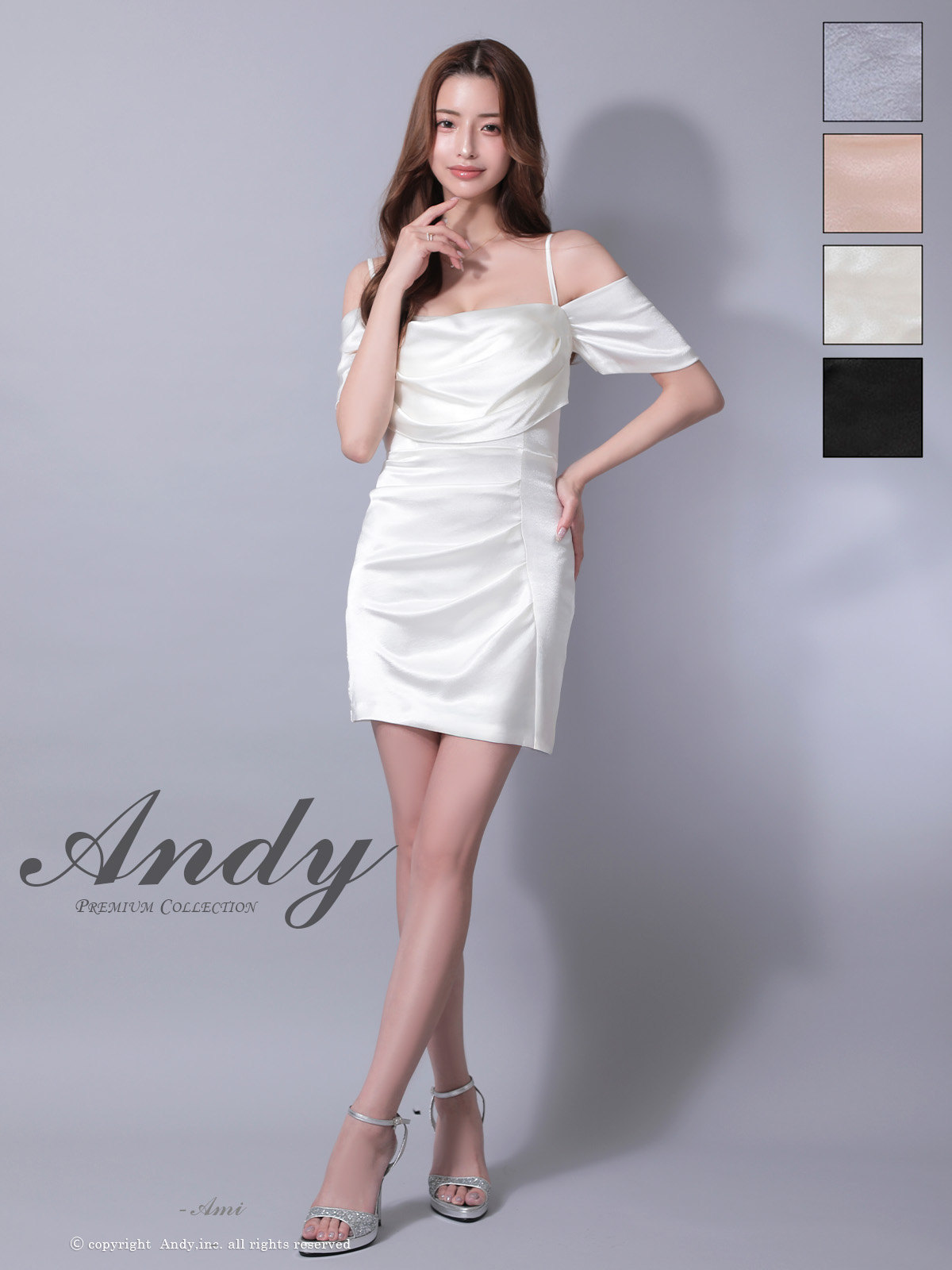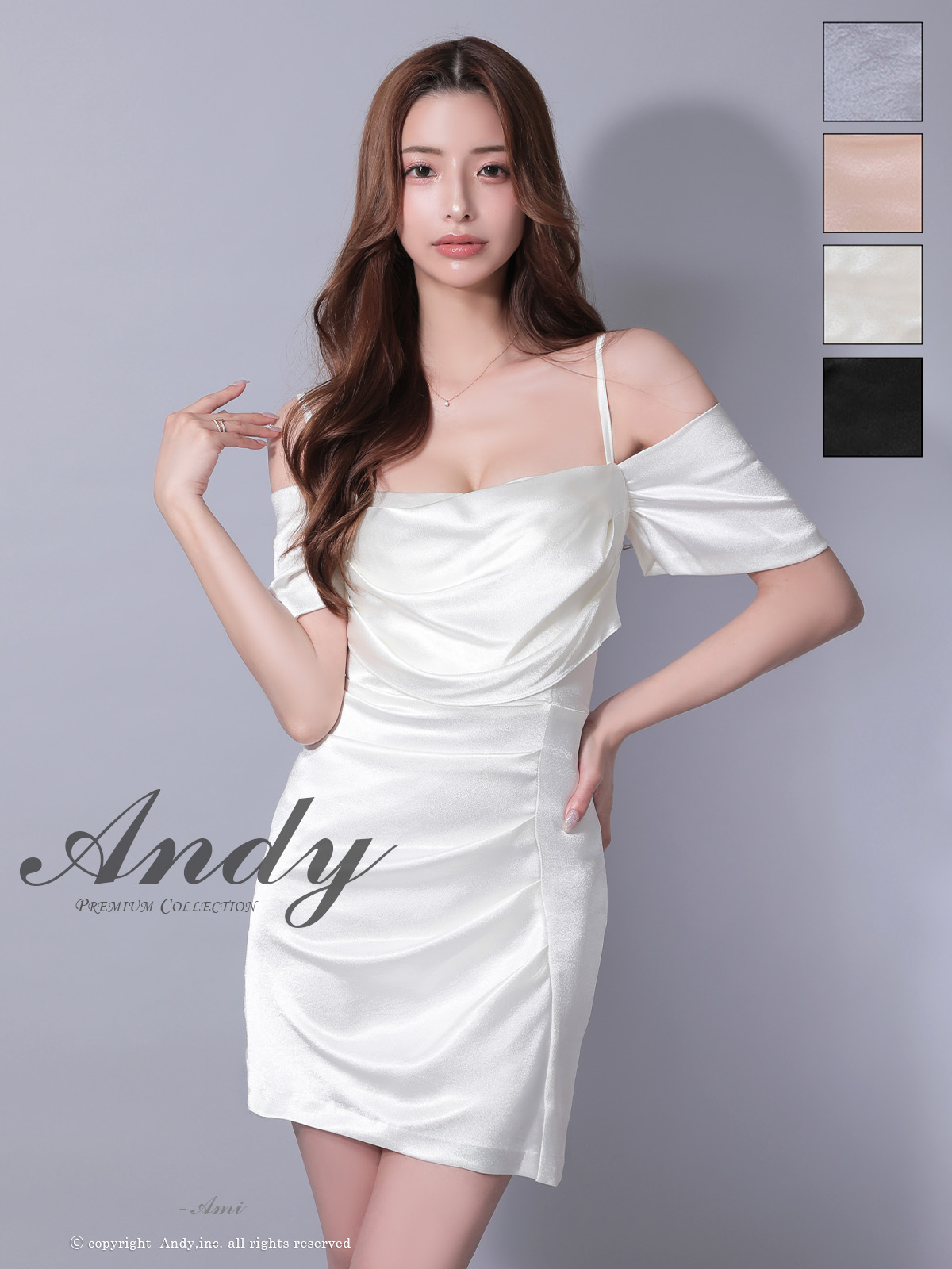 - > XSサイズあり【ANDY/アンディ】オフショルダー/ キャミ/ ドレープ/ バストジップ/ サテン/ タイト/ ミニドレス/ キャバドレス[OF05]
