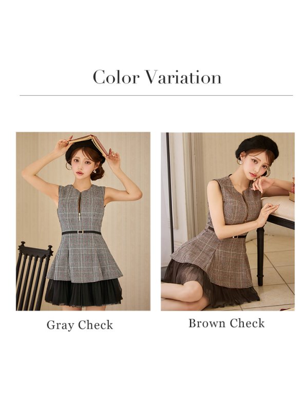 - > XSサイズあり【DEA./ディア】チェック/ ノースリーブ/ ベルトデザイン/ チュール/ フレア/ ワンピース/ ミニドレス/ キャバドレス[OF08]