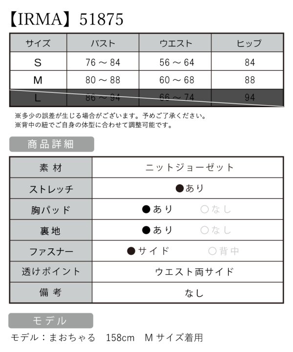 B:76-84 / W:56-64 / H:84 [着丈](脇下)約128cm |