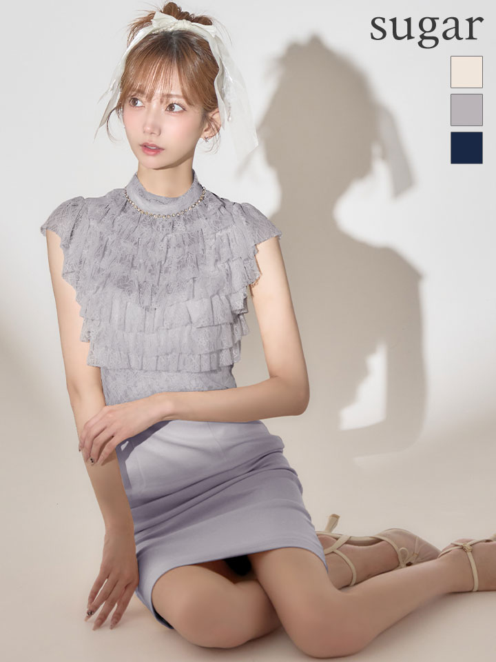 - > XSサイズあり【Veautt/ヴュート】【OF05】フロントレース/ フリル/ ビジュー/ ハイネック/ タイト/ ミディアムドレス/ キャバドレス