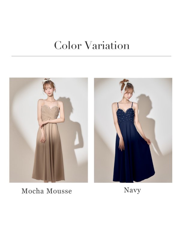 トップスに散りばめられたパール・ビジューがエレガントなミモレ丈ドレス♡