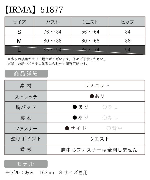 B:76-84 / W:56-64 / H:84 [着丈](脇下)約131cm |