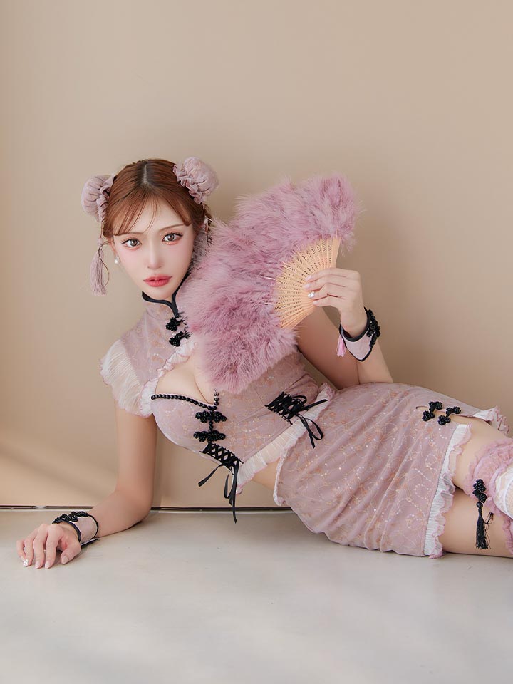 ちゃいな 中華服 レース セットアップ 2ピース ツーピース フリル 刺繍 ししゅう セクシー コスプレ ピンク ぴんく