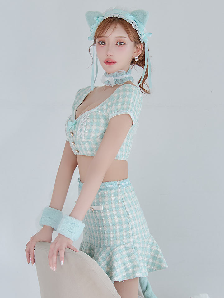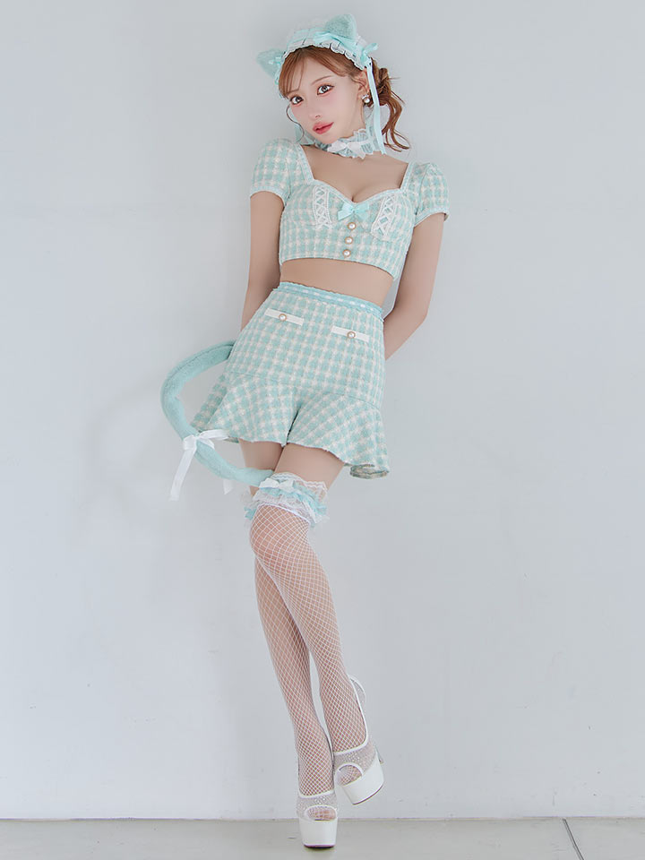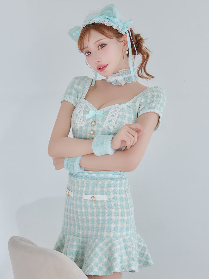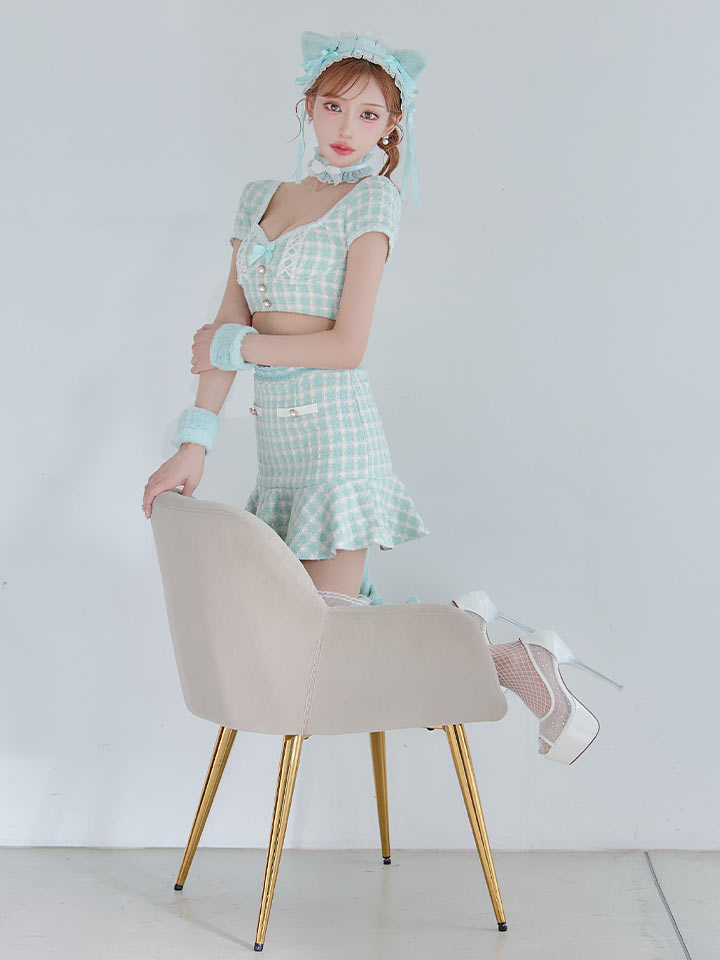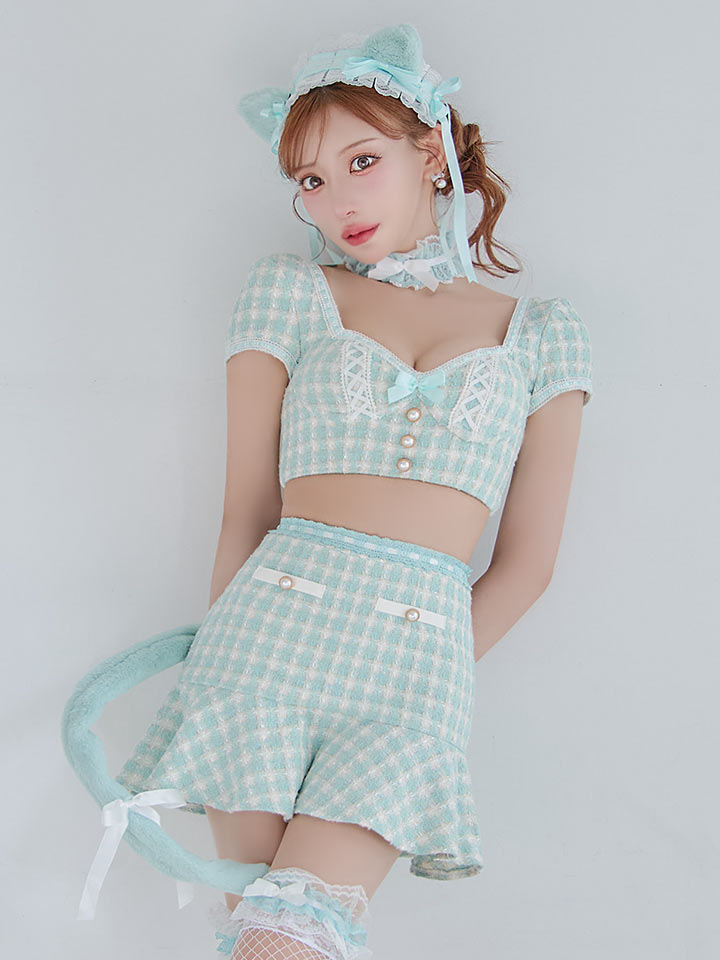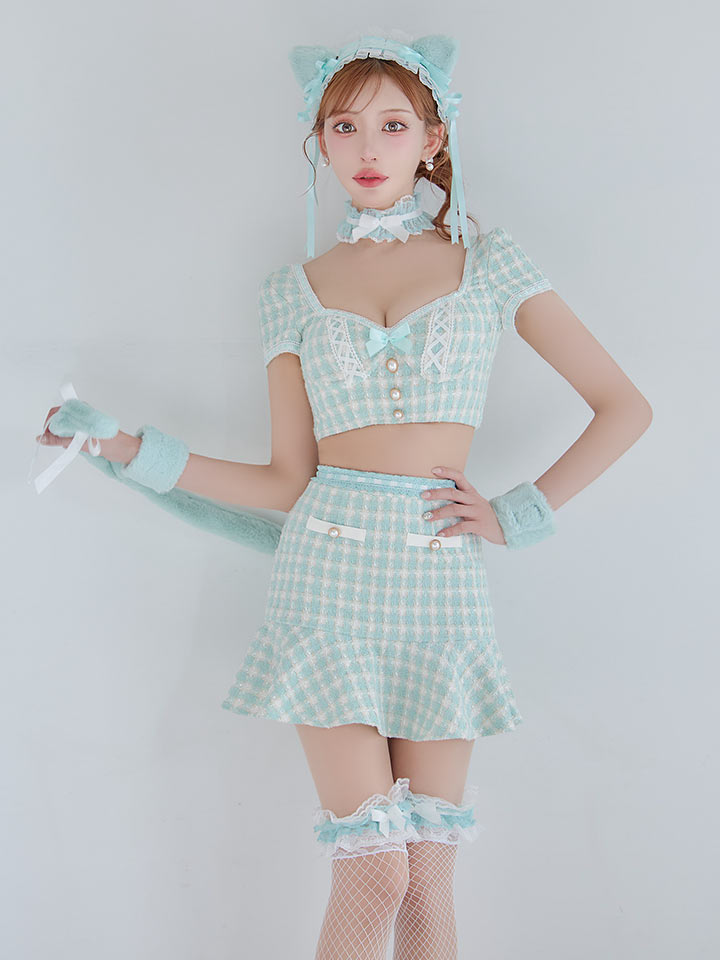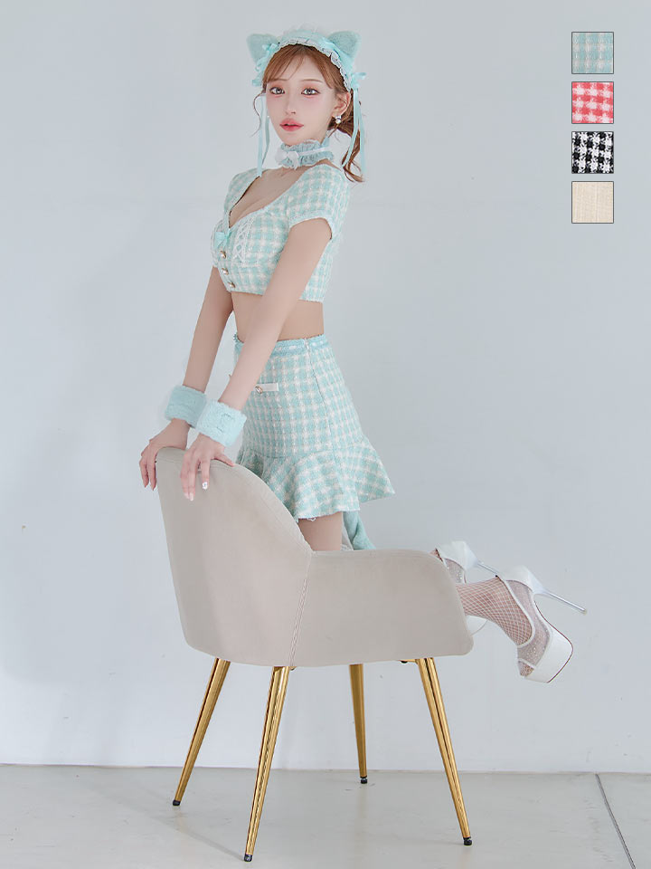 チェック れっど 赤 くろ 黒 セットアップ ツーピース 2ピース タイツ あざと 甘い スイート ねこ 猫 キャット アニマル 動物 あにまる ツイード カジュアル リボン マーメイド ランジェリー