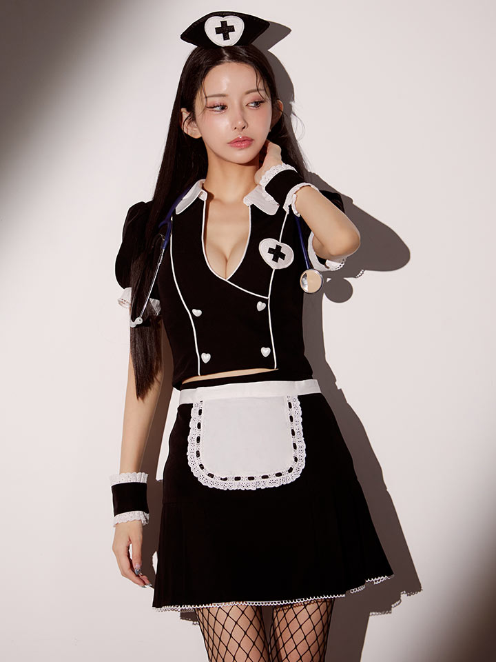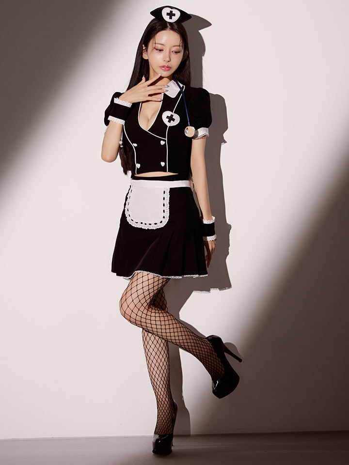 ブラック 黒 セットアップ 甘い あざと コンカフェ スイート あまい 半袖 ワンピース ナース 網タイツ