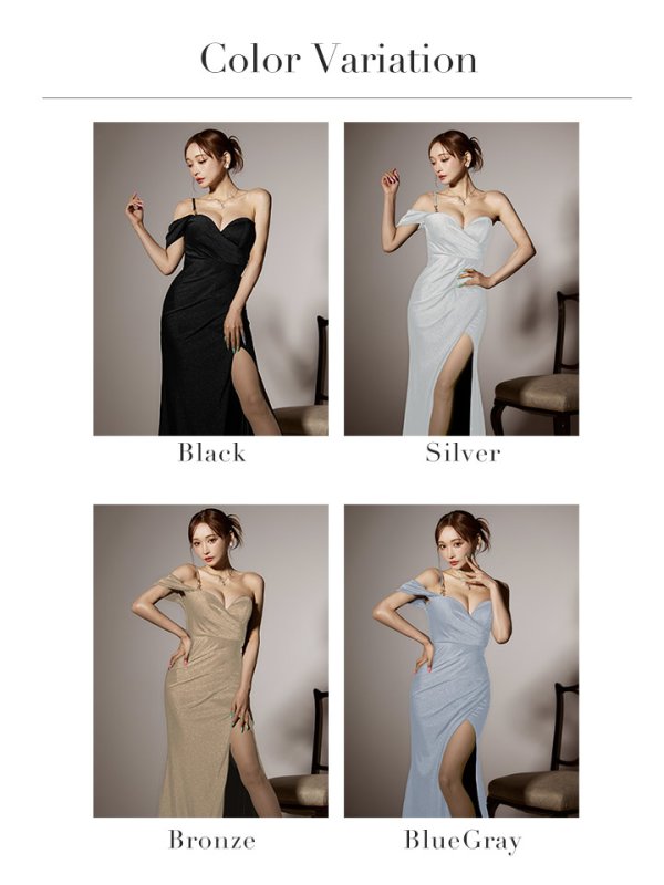 繊細に煌めくラメ生地がセクシーさの中にエレガンスさも感じさせる1着です。