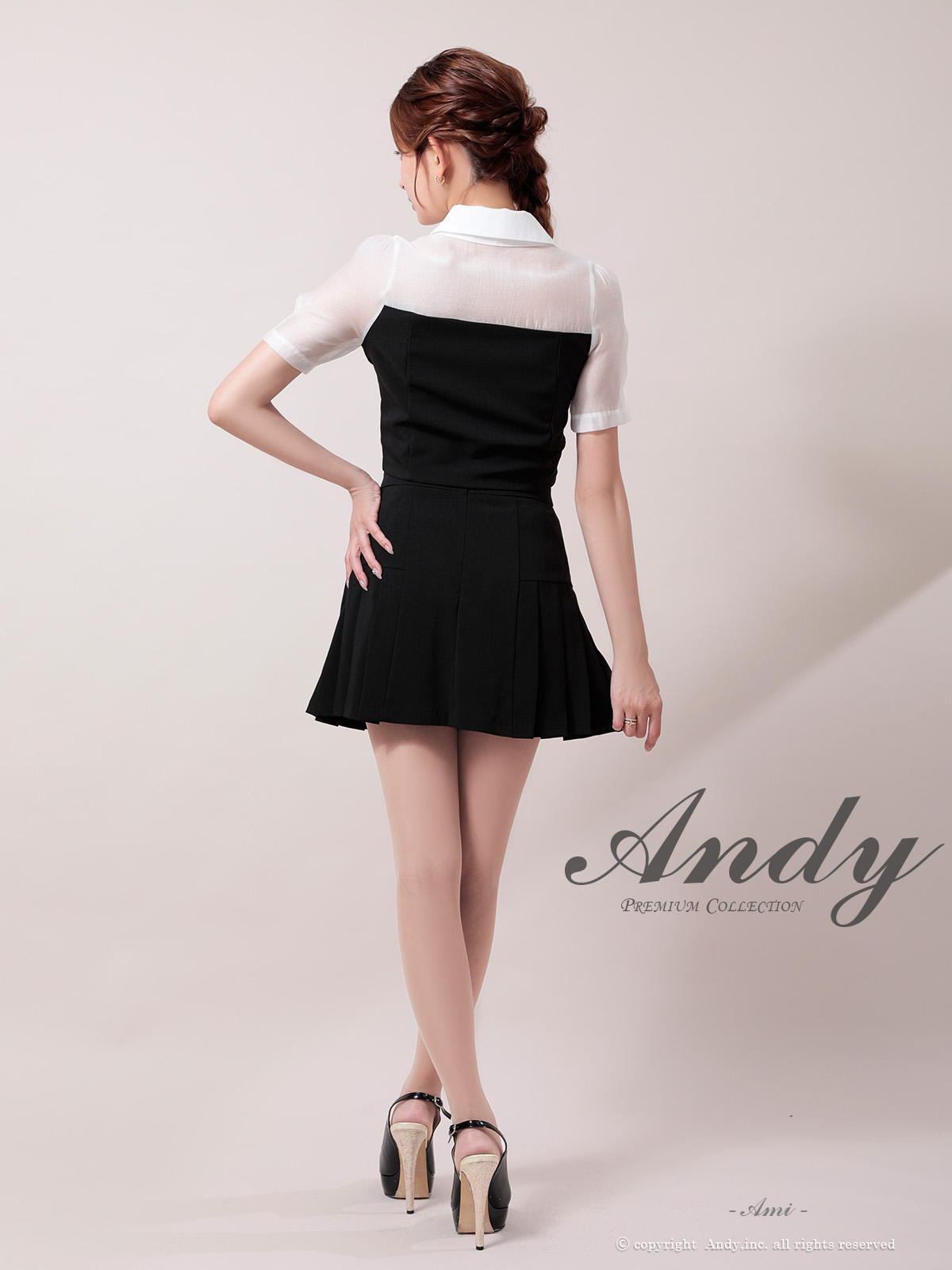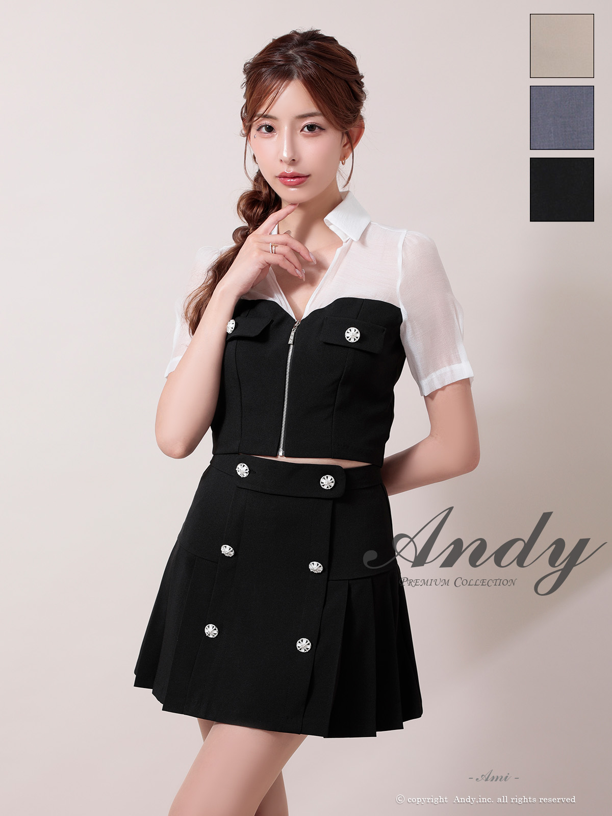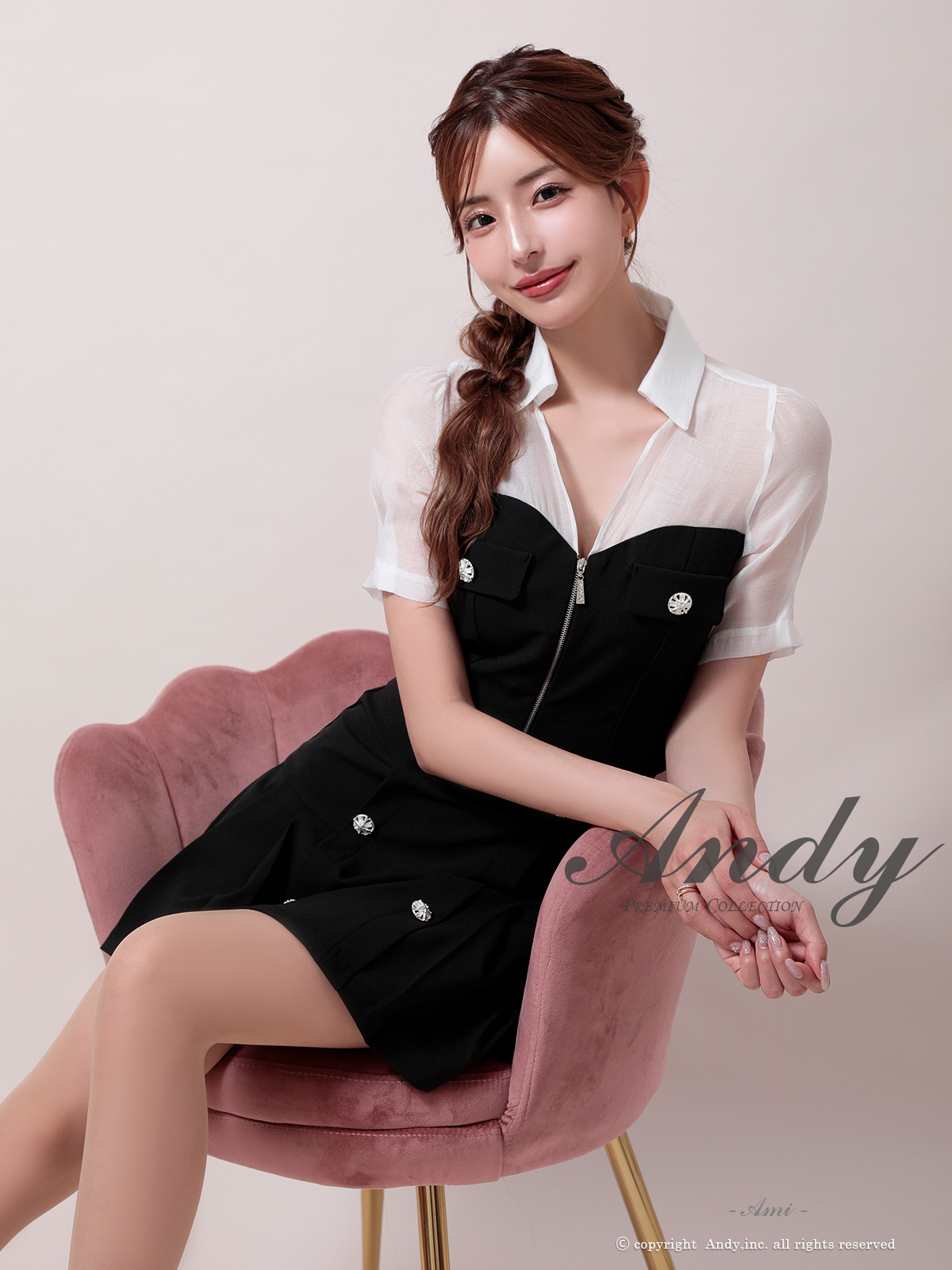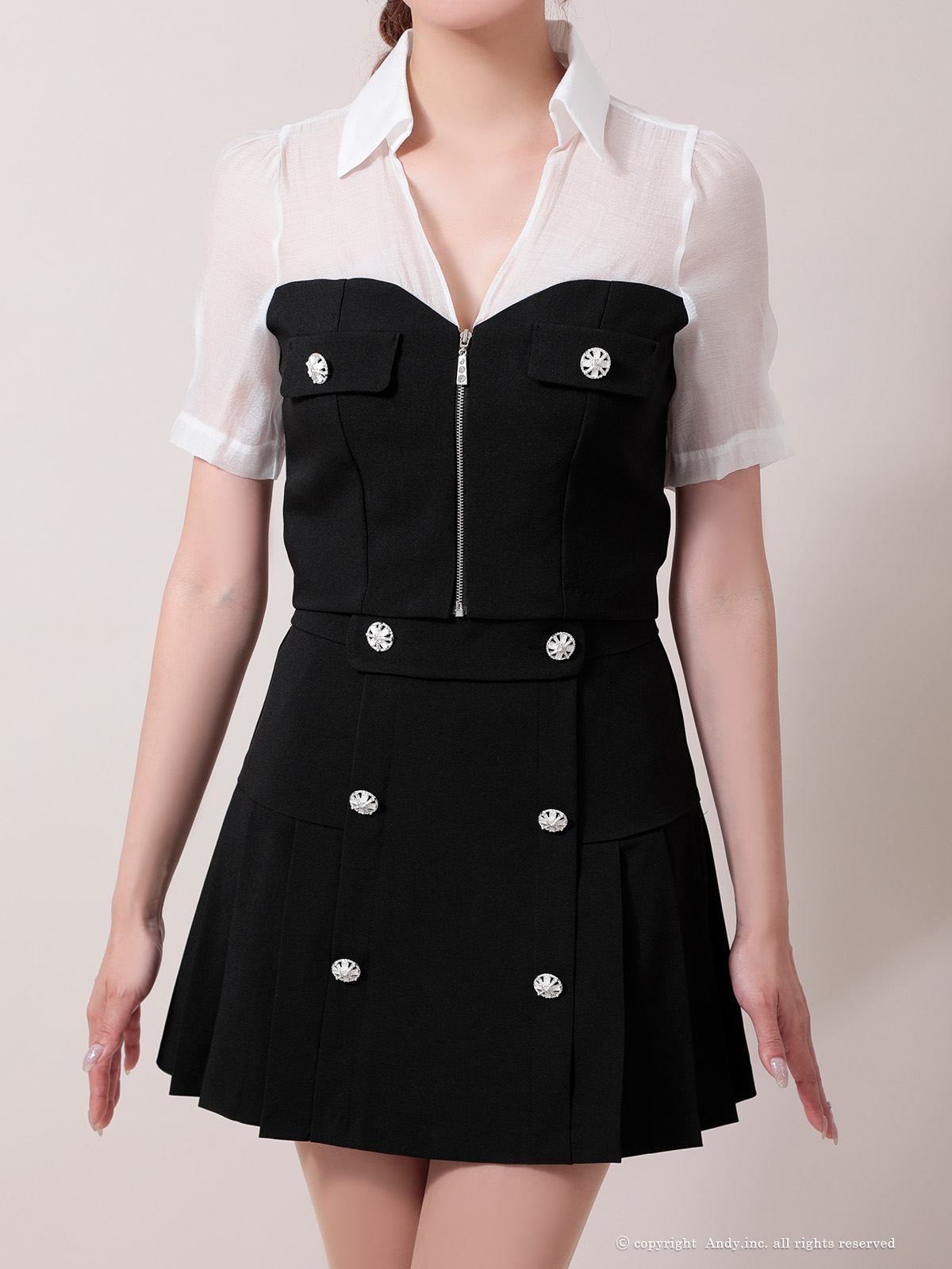 - > XSサイズあり【ANDY/アンディ】襟付き/ 重ね着風/ ビジューボタン/ フロントジッパー/ バイカラー/ 半袖/ 袖あり/ プリーツ/ フレア/ セットアップ/ ミニドレス/ キャバドレス[OF05]