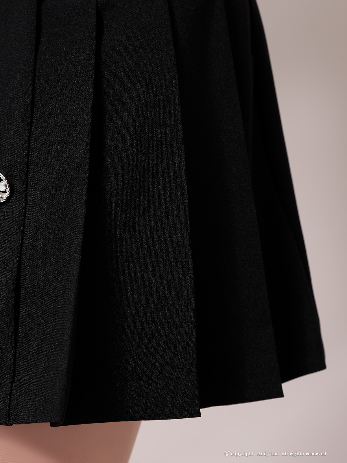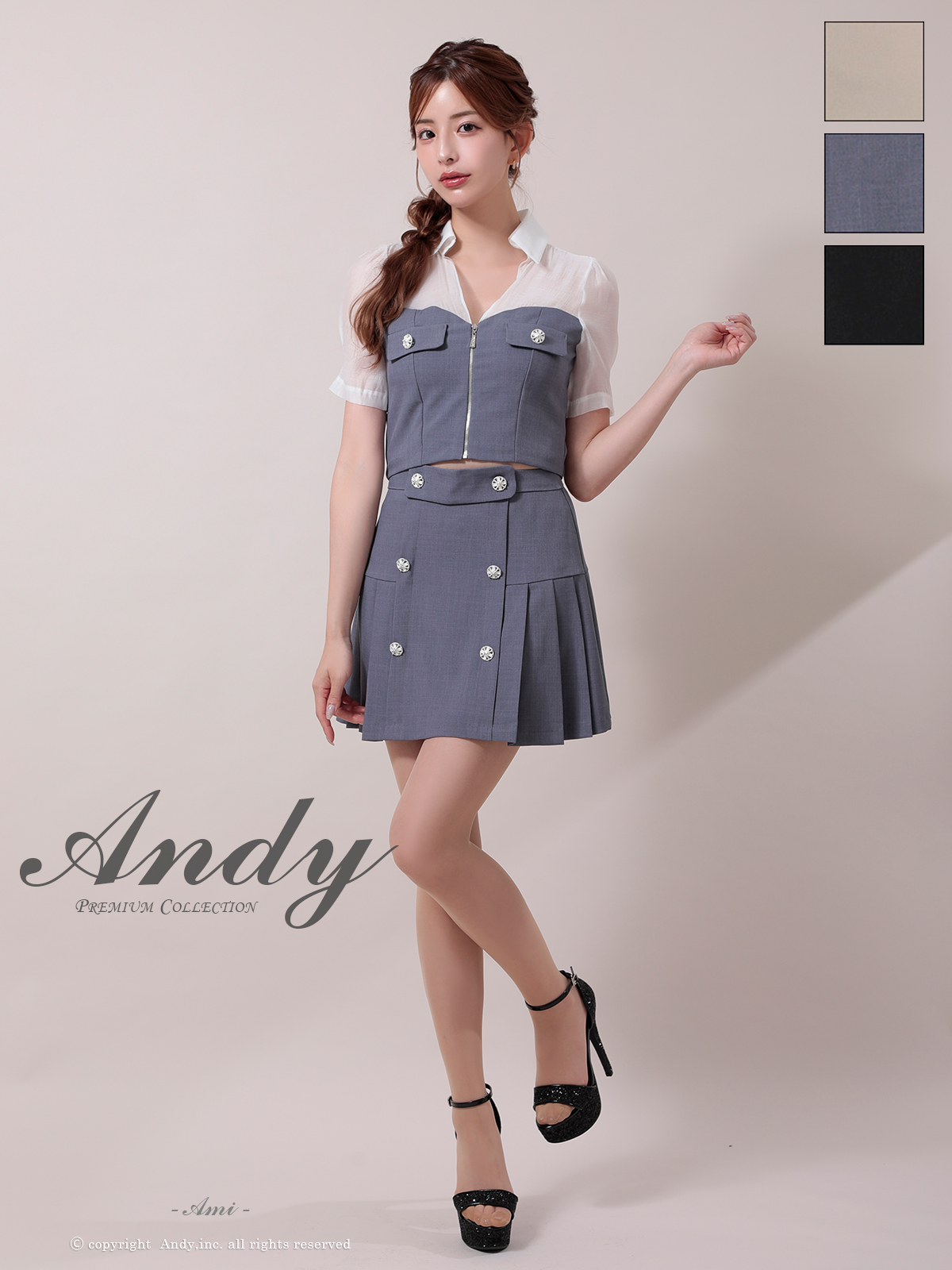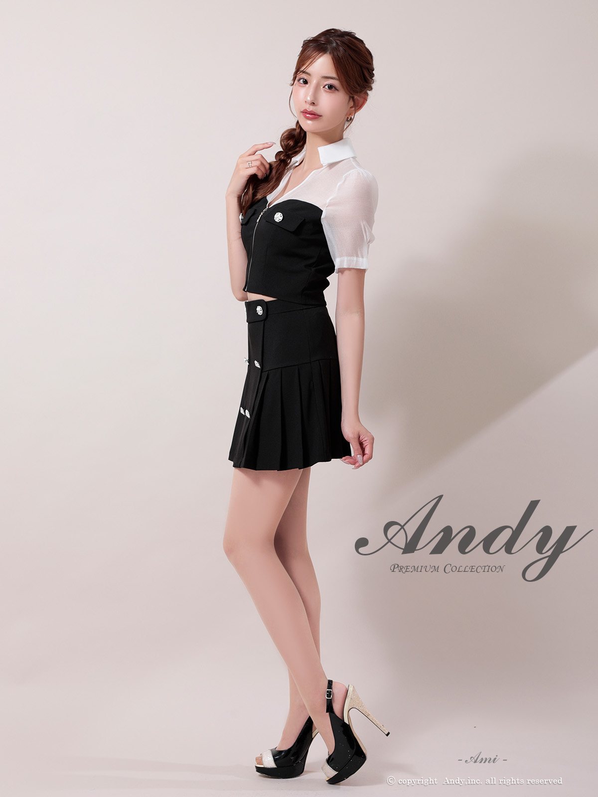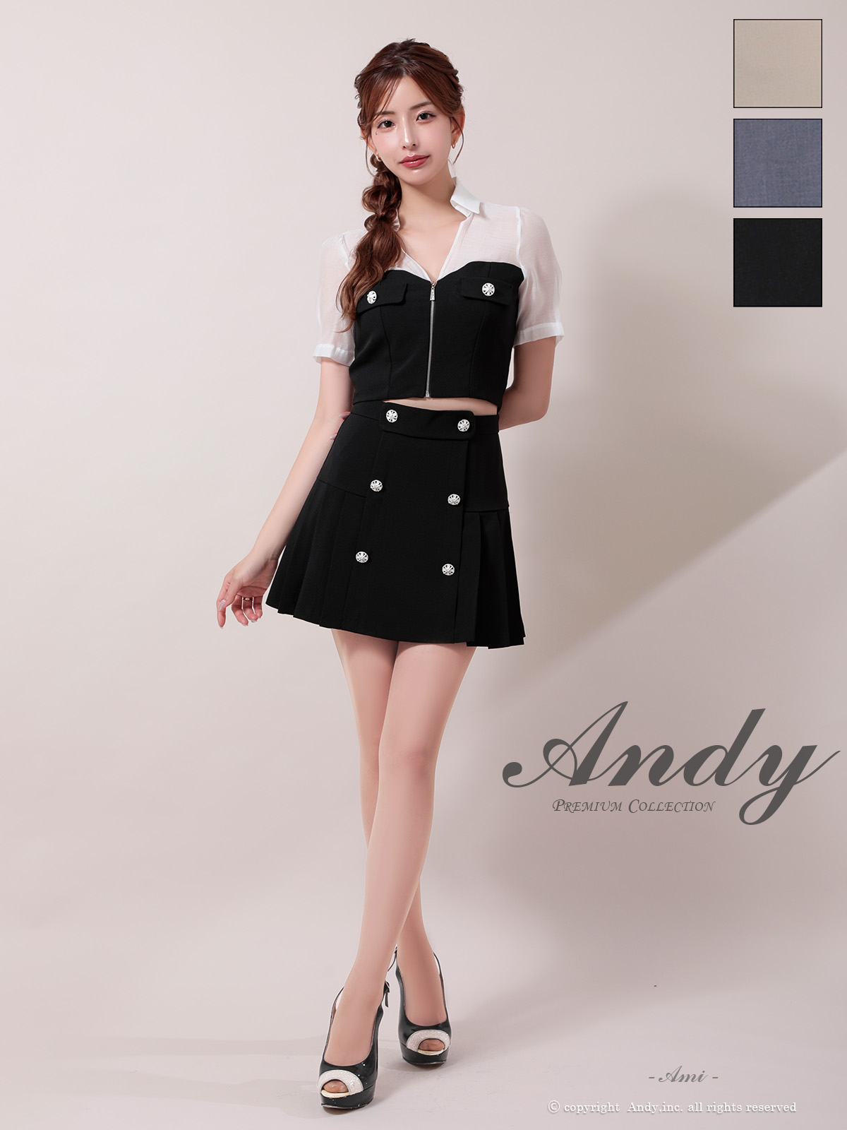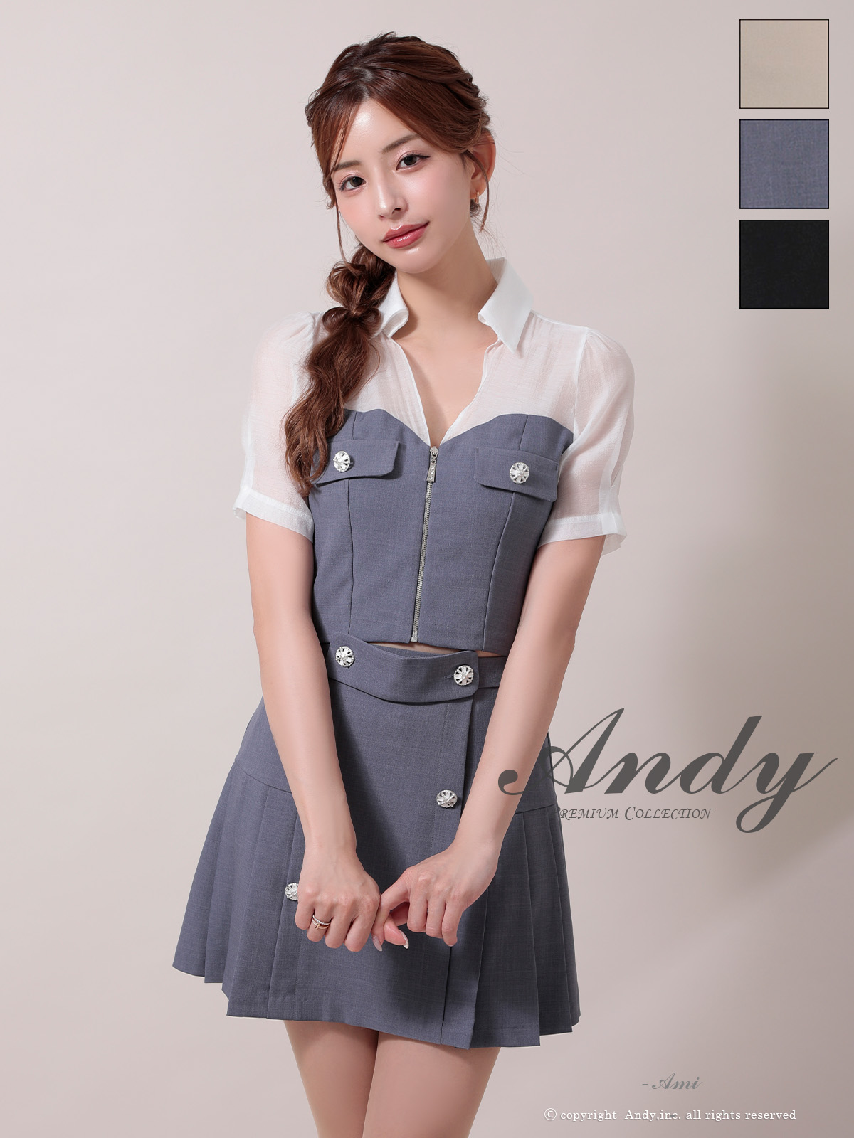 - > XSサイズあり【ANDY/アンディ】襟付き/ 重ね着風/ ビジューボタン/ フロントジッパー/ バイカラー/ 半袖/ 袖あり/ プリーツ/ フレア/ セットアップ/ ミニドレス/ キャバドレス[OF05]