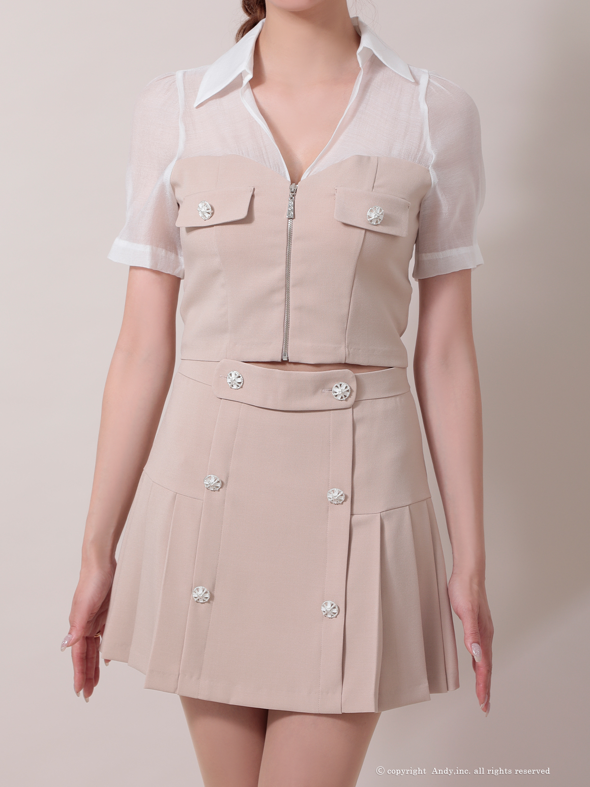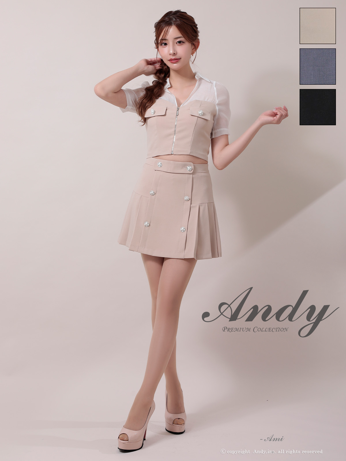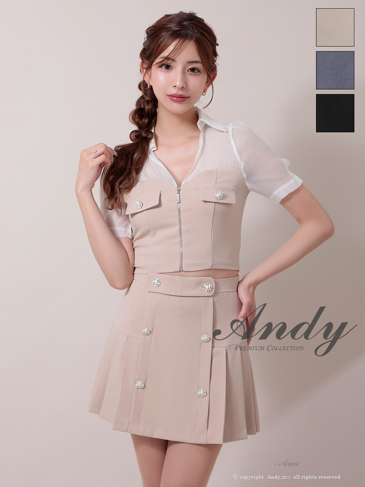 XSサイズあり【ANDY/アンディ】襟付き/ 重ね着風/ ビジューボタン/ フロントジッパー/ バイカラー/ 半袖/ 袖あり/ プリーツ/ フレア/ セットアップ/ ミニドレス/ キャバドレス[OF05] [OK2979-BE-2508]