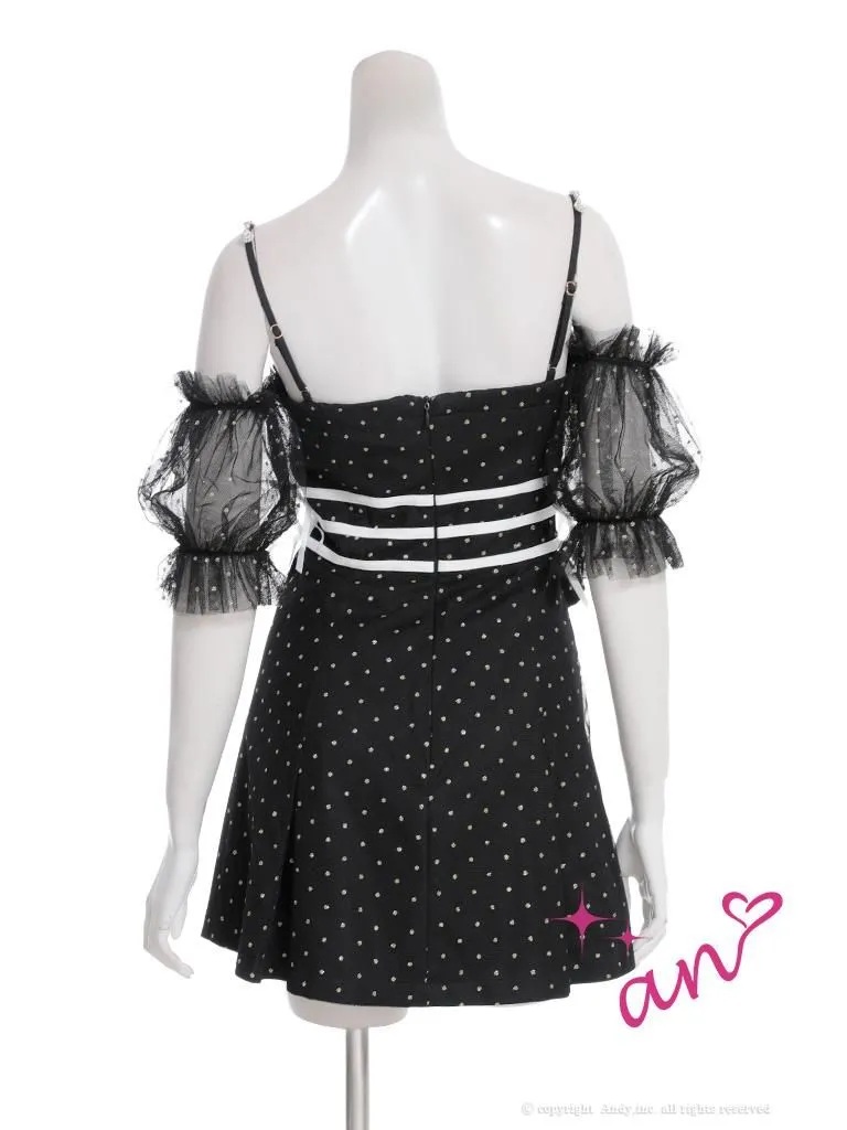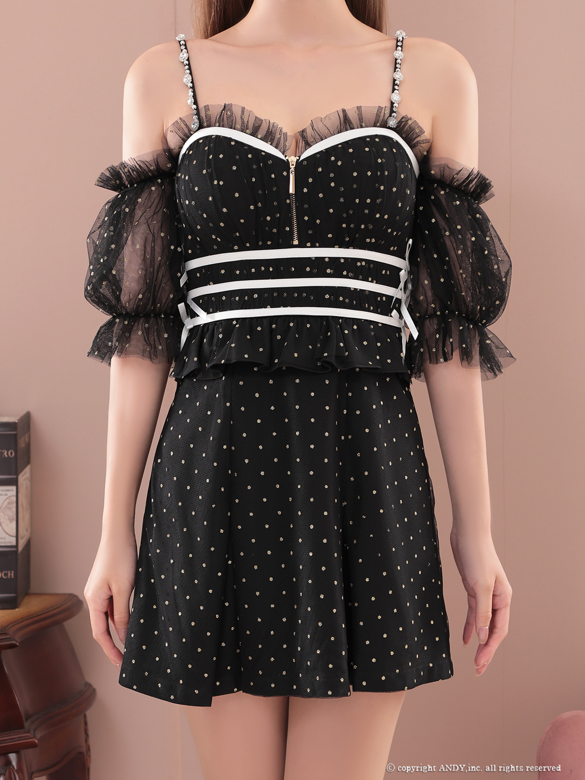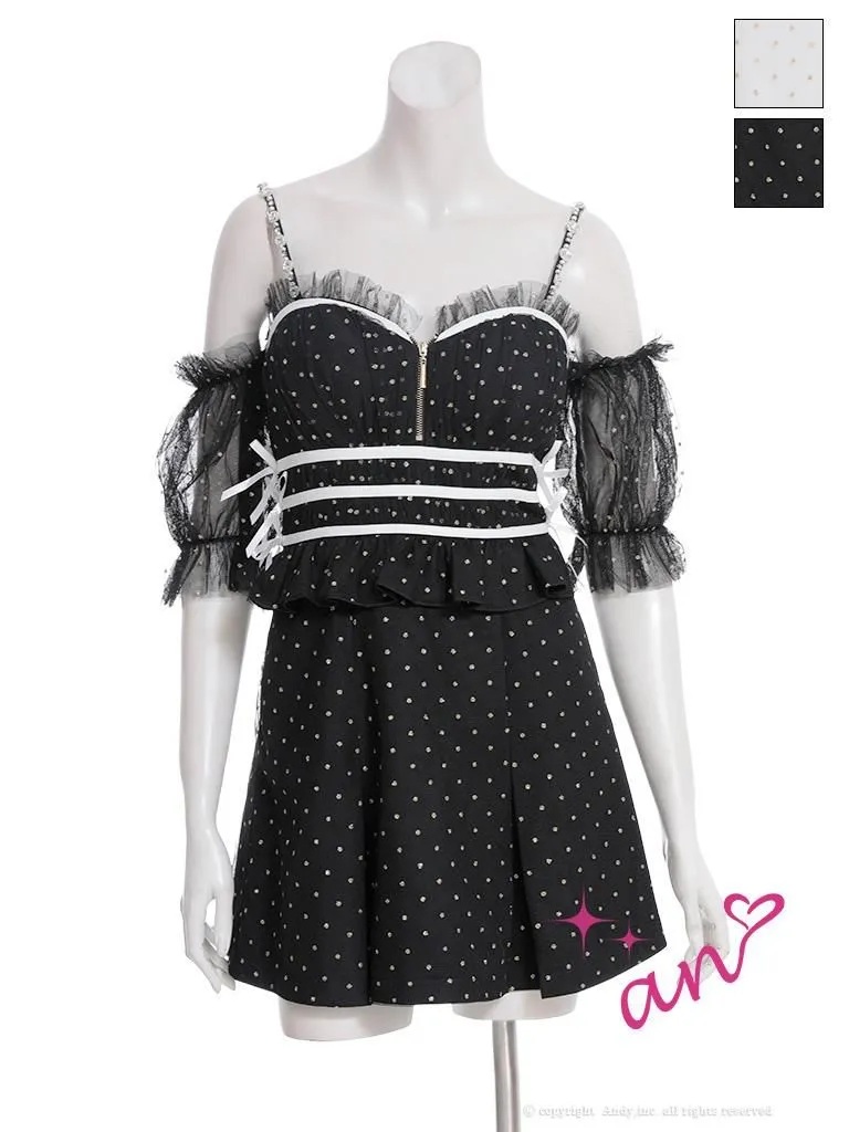 XSサイズあり【an /アン】ドット柄/ 袖付き/ フリル/ キャミ/ オフショル/ バストジップ/ ラインリボン/ フレア/ ミニドレス/ キャバドレス[OF05]