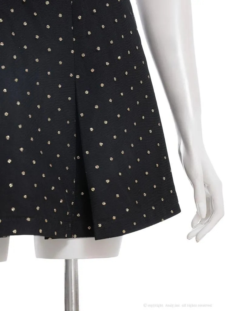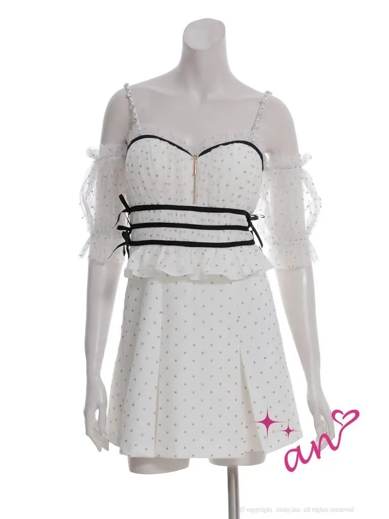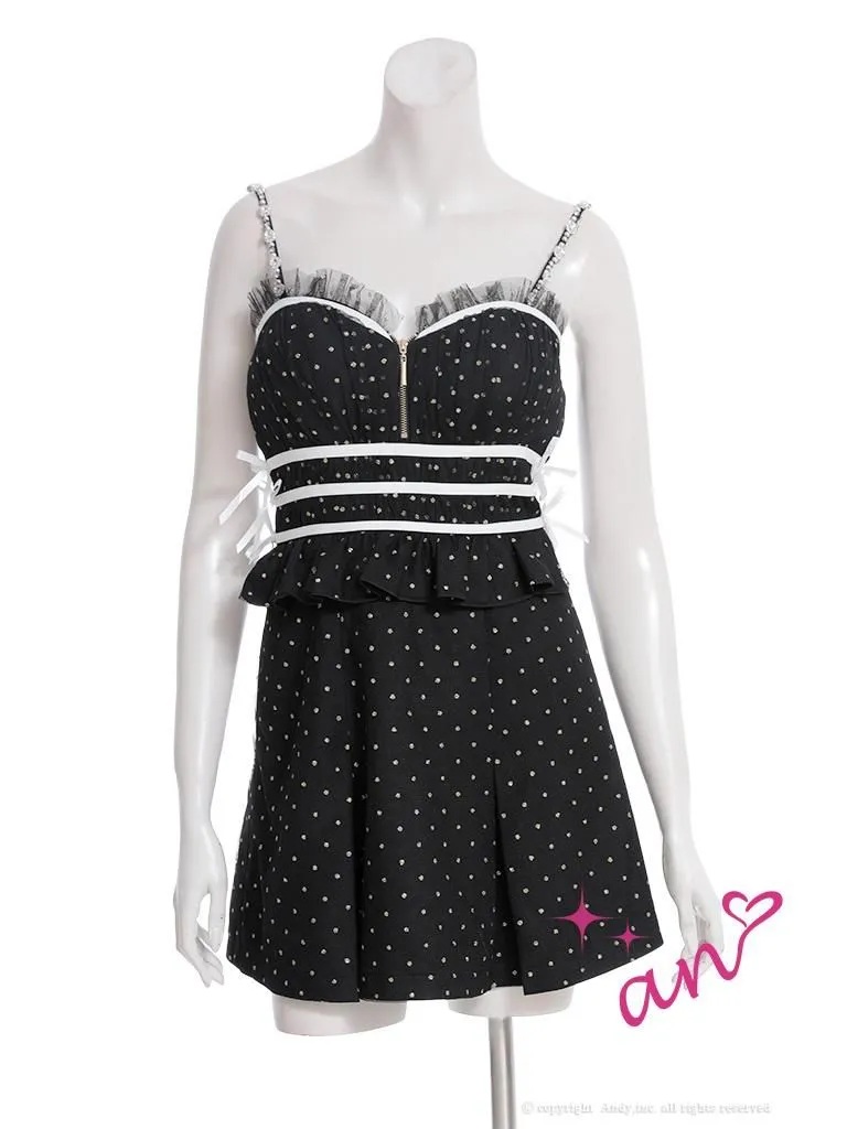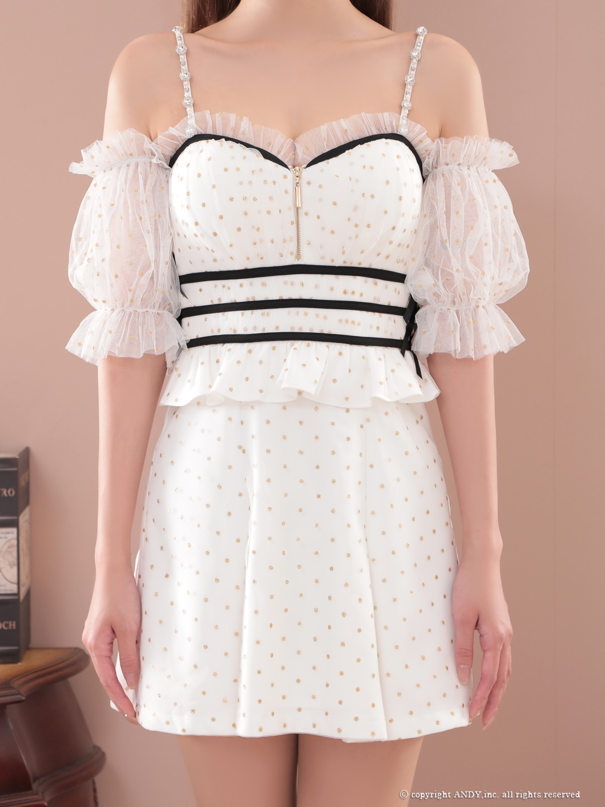 XSサイズあり【an /アン】ドット柄/ 袖付き/ フリル/ キャミ/ オフショル/ バストジップ/ ラインリボン/ フレア/ ミニドレス/ キャバドレス[OF05]