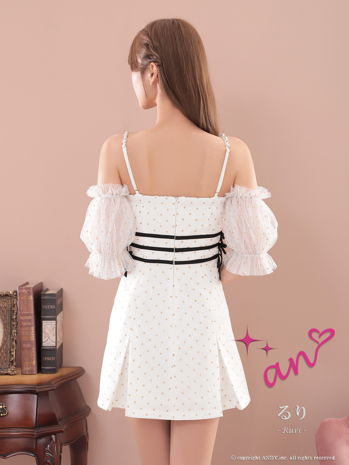 - > XSサイズあり【an /アン】ドット柄/ 袖付き/ フリル/ キャミ/ オフショル/ バストジップ/ ラインリボン/ フレア/ ミニドレス/ キャバドレス[OF05]
